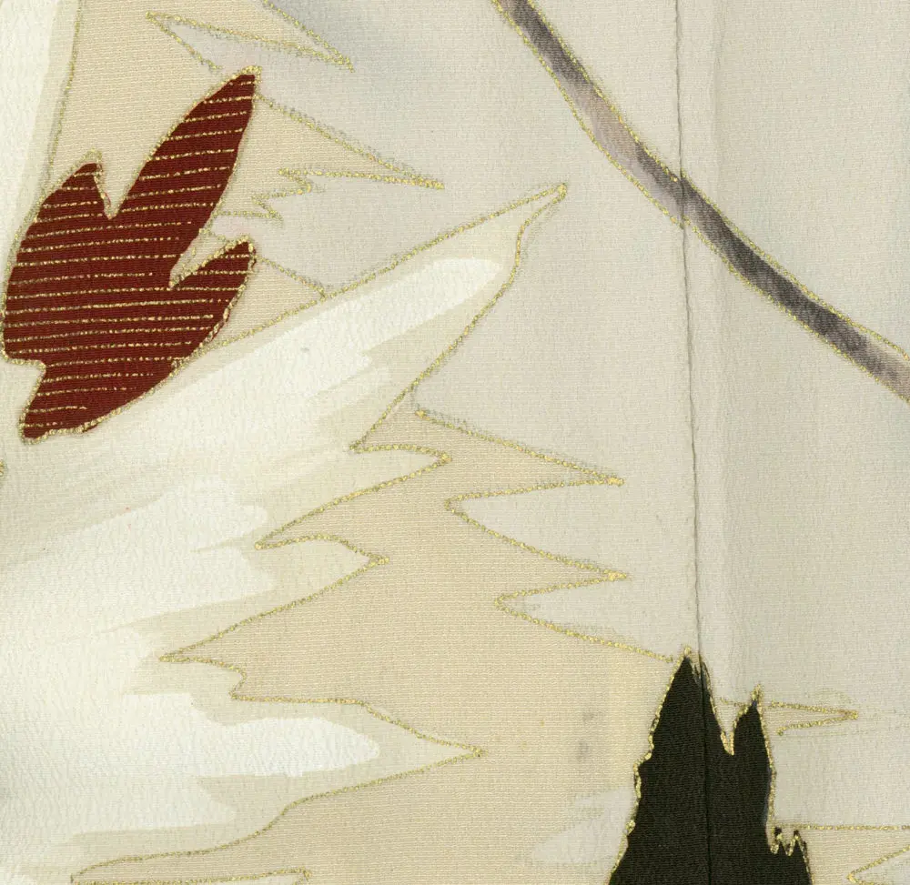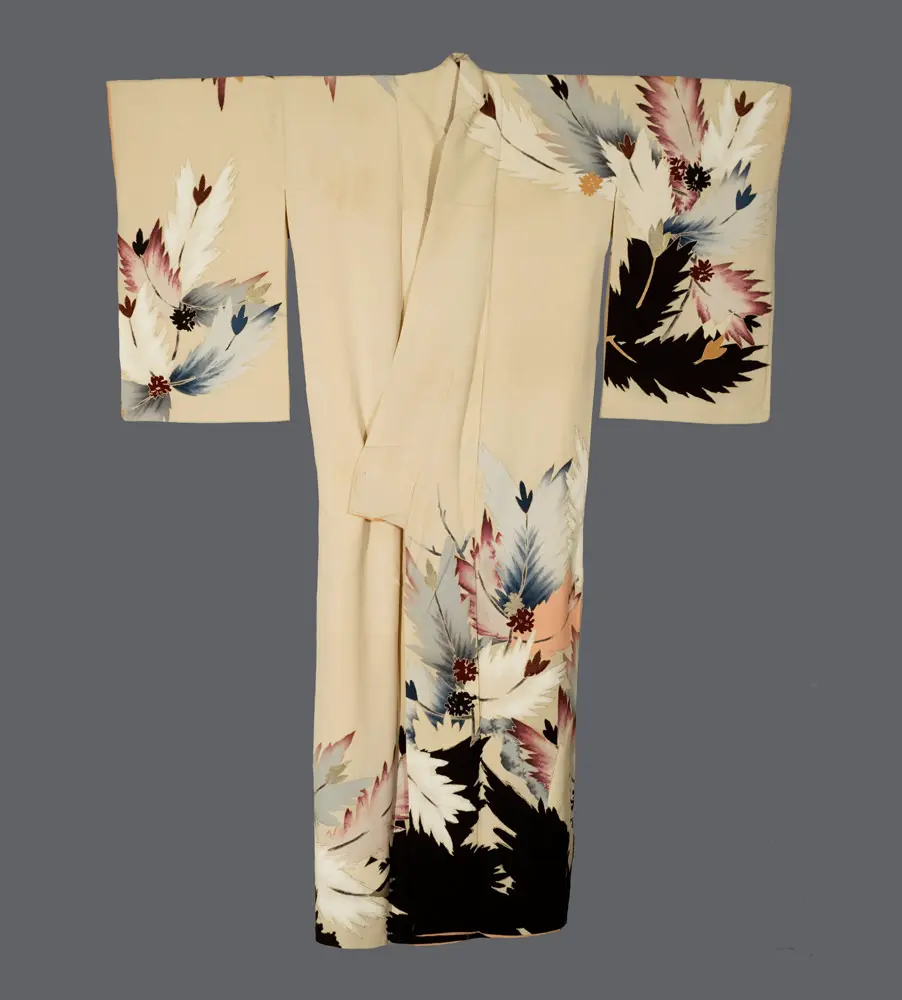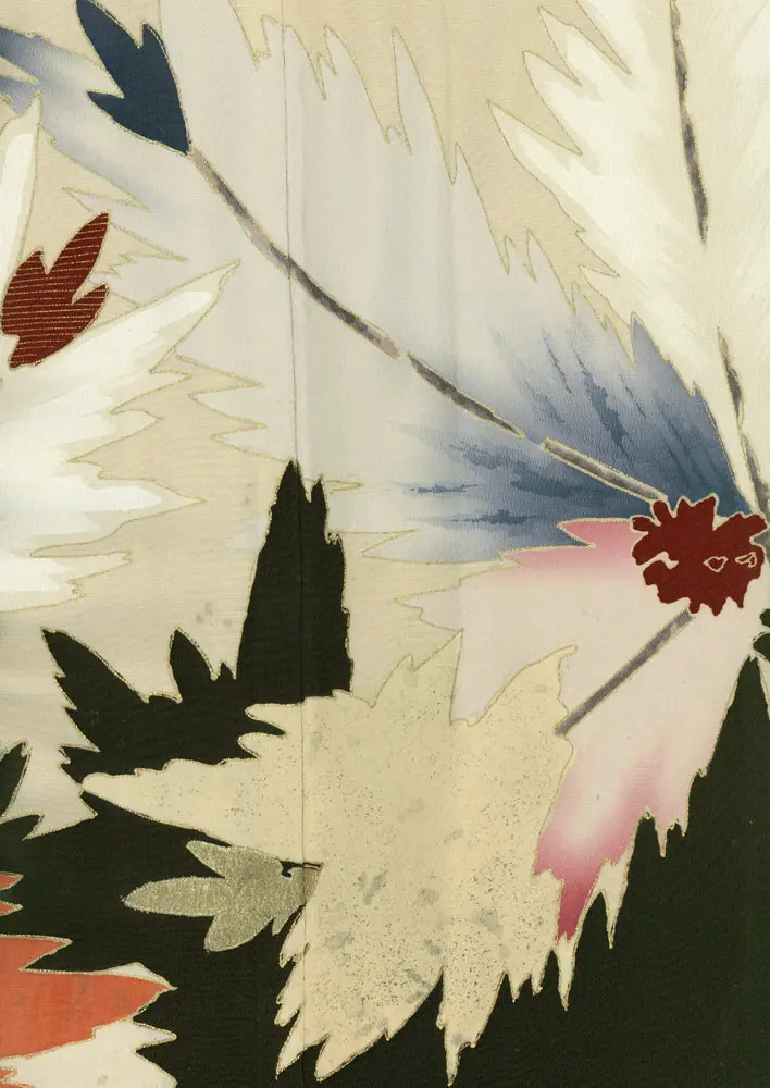 This silk kimono displays a sophisticated interplay between naturalistic floral elements and the traditional Japanese yabane (arrow feather) motif. The cream-colored silk serves as an elegant backdrop for bold, painterly designs that combine white, burgundy, black, and coral-orange feathered forms arranged in dynamic, sweeping compositions. The artistic treatment reveals influences from both traditional Japanese decorative arts and modern artistic sensibilities, particularly in the loose, expressive brushwork that suggests movements like Japanese mingei (folk craft) aesthetics or even Western-influenced Japanese art from the Meiji period onward.