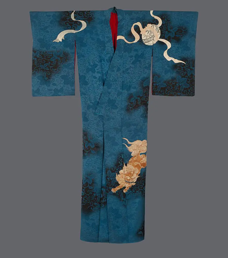 This kimono evokes elements of Japanese Baroque in its dramatic, swirling compositions and rich decorative density. The dynamic movement of the komainu and flowing elements also suggests influences from traditional Japanese screen painting (byōbu-e) and the decorative arts of the Edo period.