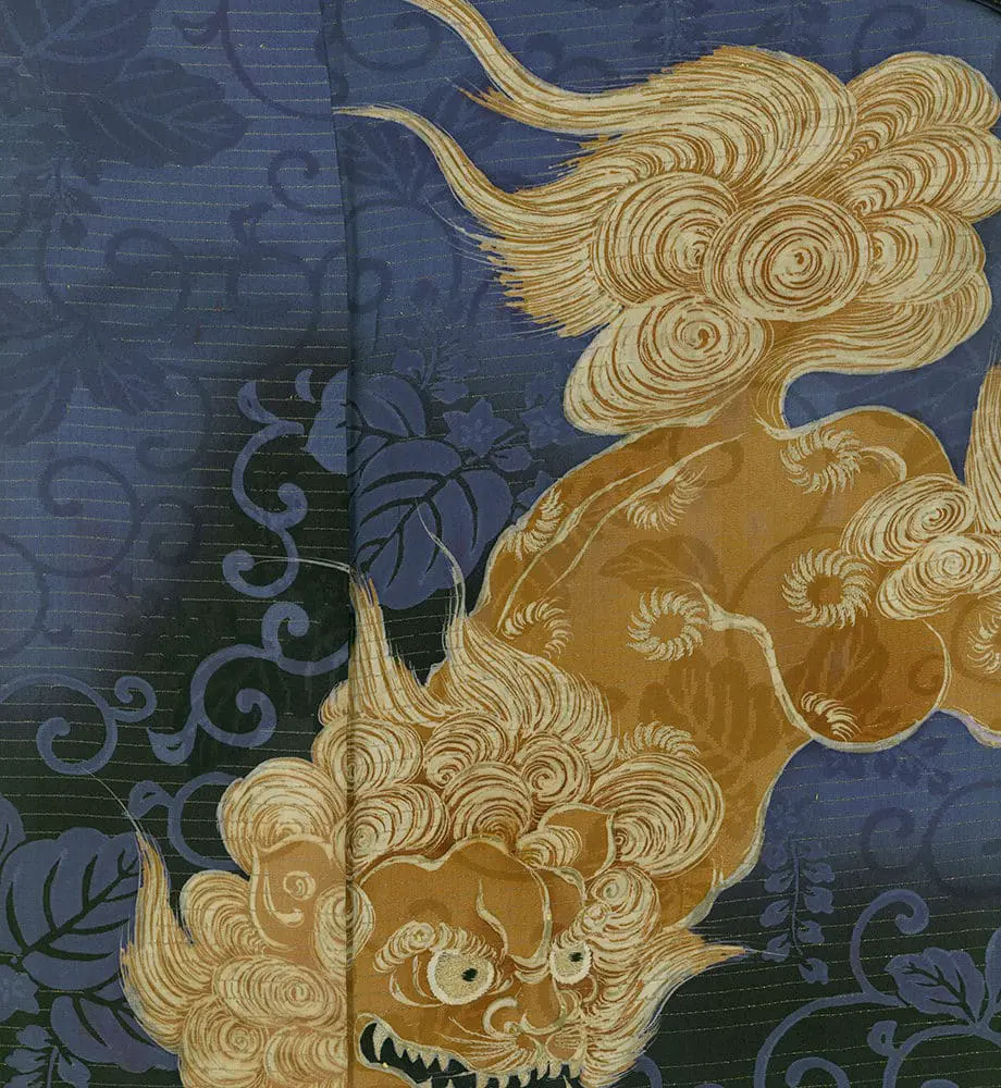 This rinzu (damask) kimono presents a masterful display of traditional Japanese textile artistry, featuring powerful komainu (mythical lion-dogs) rendered in exquisite yuzen painting technique against a rich indigo blue ground. The detailed imagery reveals the sophisticated layering of decorative techniques that characterize high-end Japanese textiles.