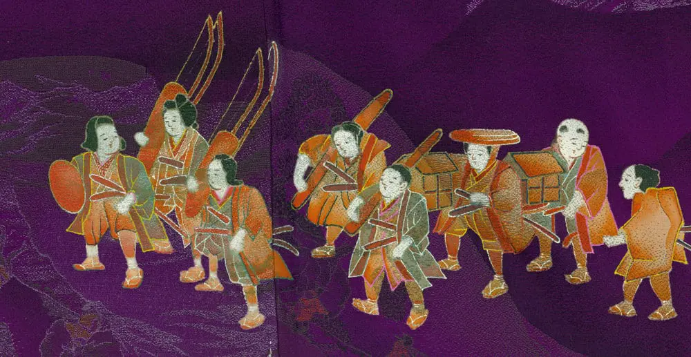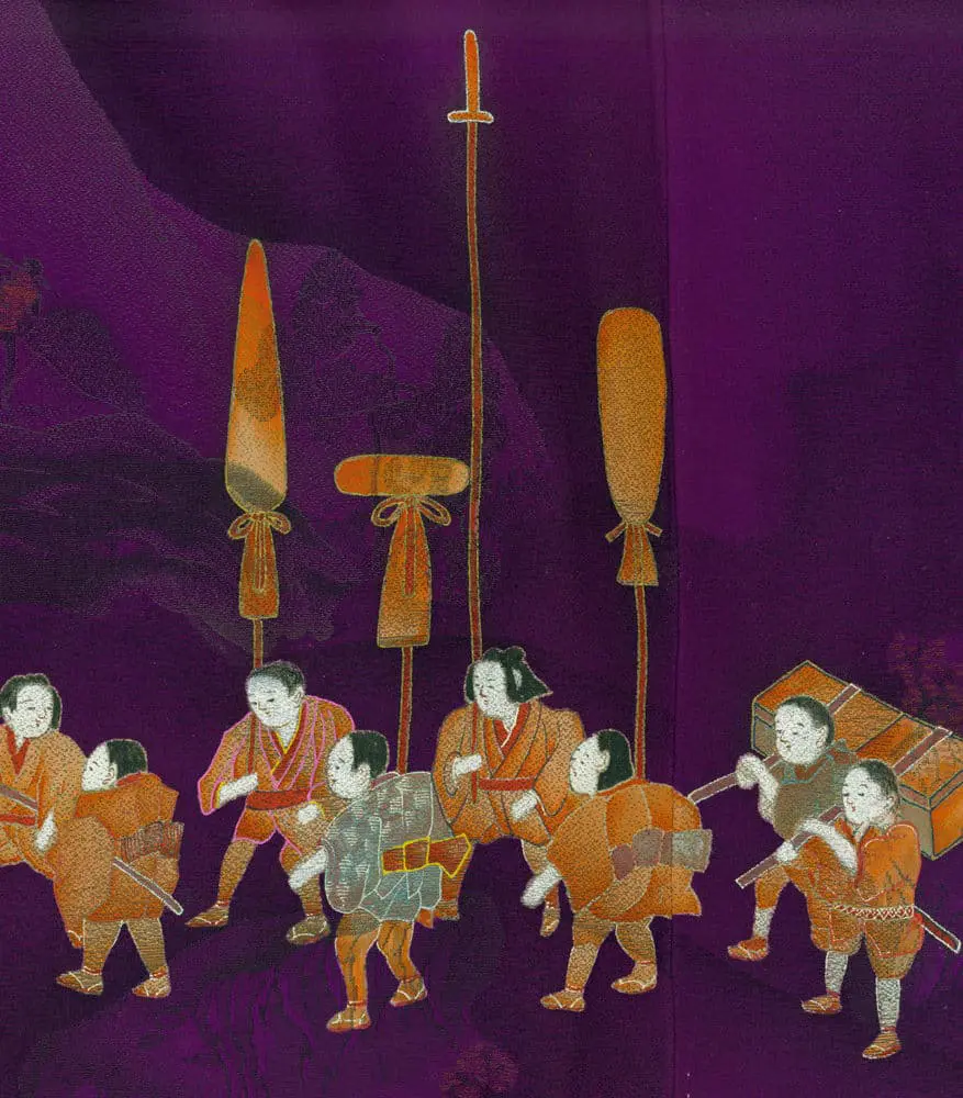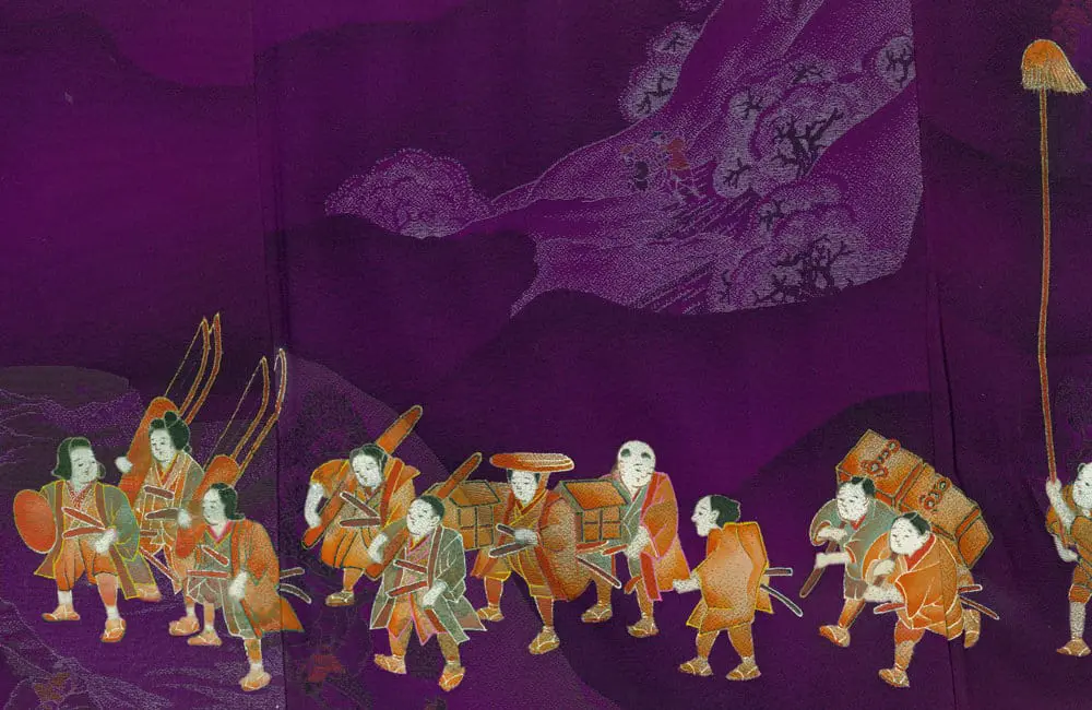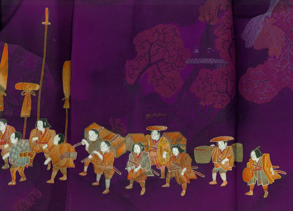 The thirty-two figures of the procession, meticulously rendered through yuzen resist-dyeing and painting techniques, create a dynamic frieze along the kimono's lower portion. These elaborately dressed samurai and retainers, depicted in vibrant oranges, golds, and earth tones, carry the symbolic weight of feudal obligation and ceremony. Their procession represents the sankin-kotai system, where regional lords were required to maintain residences in Edo and travel there regularly—a practice that both demonstrated loyalty and served as a form of political control. The artist's attention to individual figures, each distinct in posture and costume, reflects the influence of genre painting traditions that celebrated everyday life and ceremony.