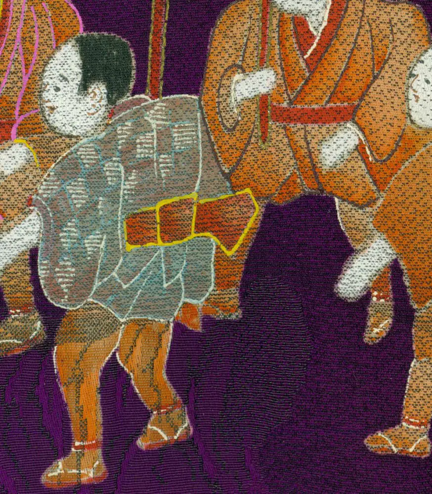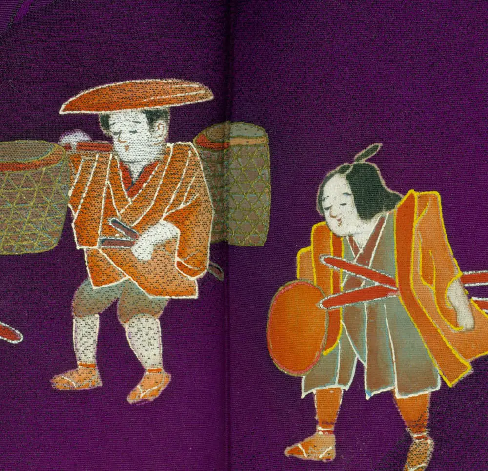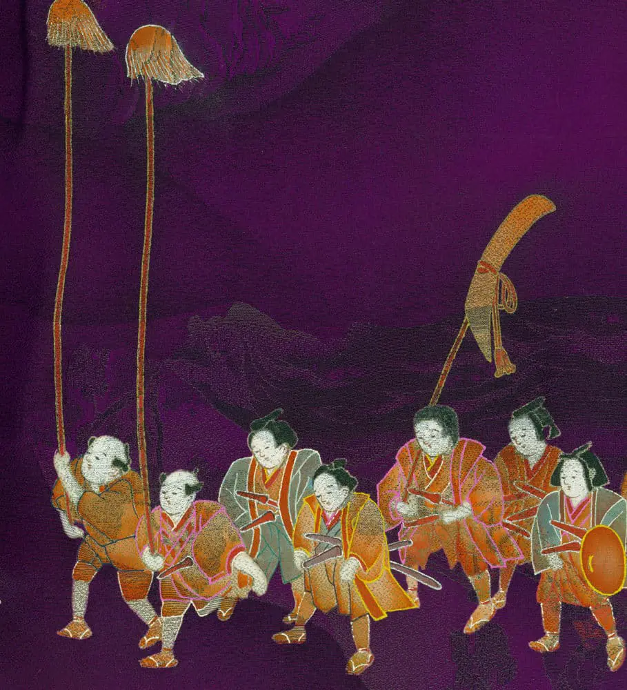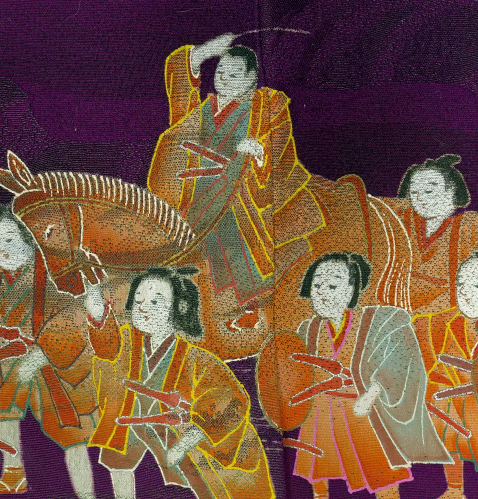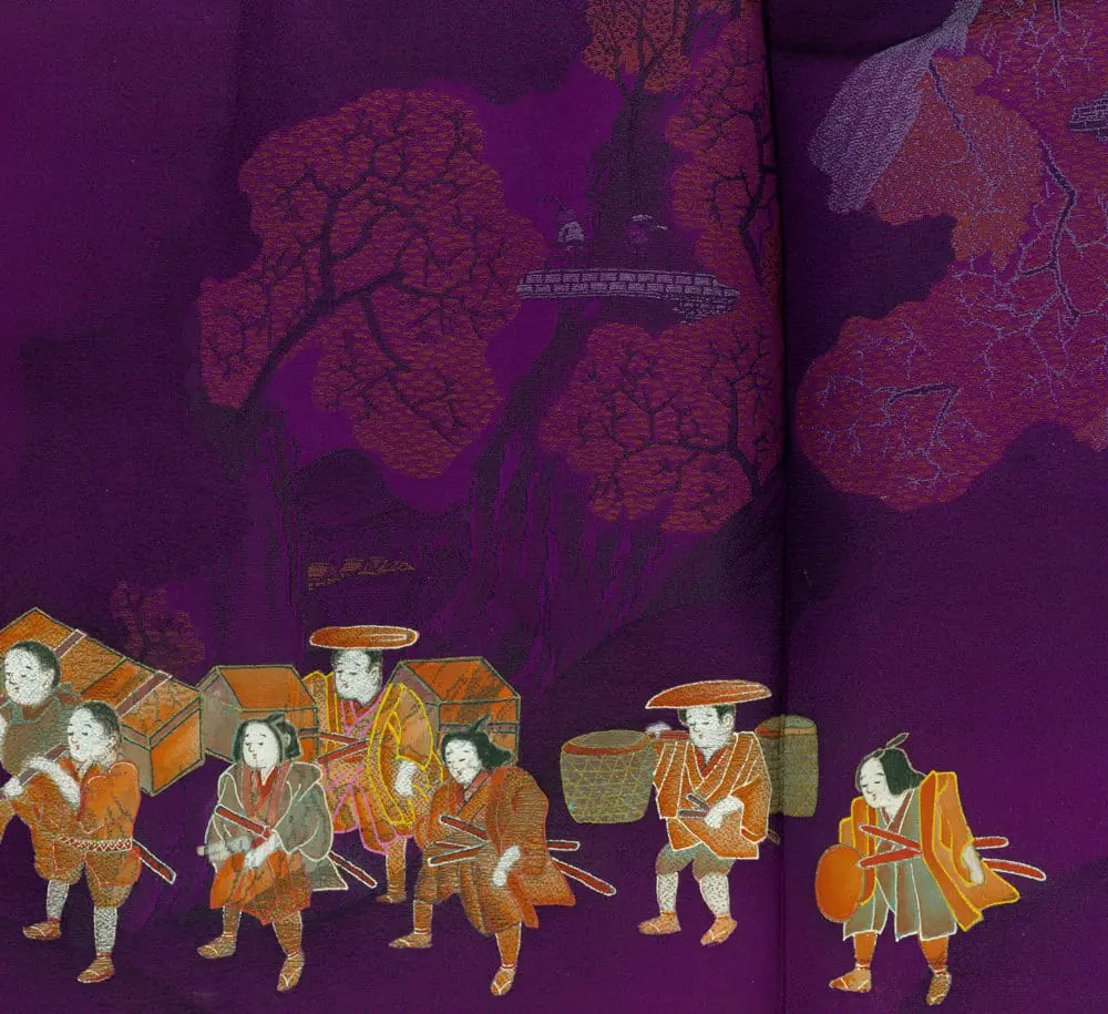 The background's flowing cloud patterns, created with woven urushi-coated threads that shimmer subtly against the deep purple silk, evoke the classical yamato-e painting tradition while adding textural richness. These stylized clouds serve both decorative and symbolic functions, representing the transient nature of worldly power and the ethereal realm between earth and heaven. The overall aesthetic demonstrates the continued vitality of traditional Japanese artistic principles during the early 20th century, when such historical themes provided cultural anchoring amid rapid modernization. The sophisticated interplay of weaving and dyeing techniques creates a textile that functions simultaneously as wearable art and historical document, embodying the Japanese aesthetic principle of finding profound beauty in the intersection of craft, narrative, and symbolic meaning.