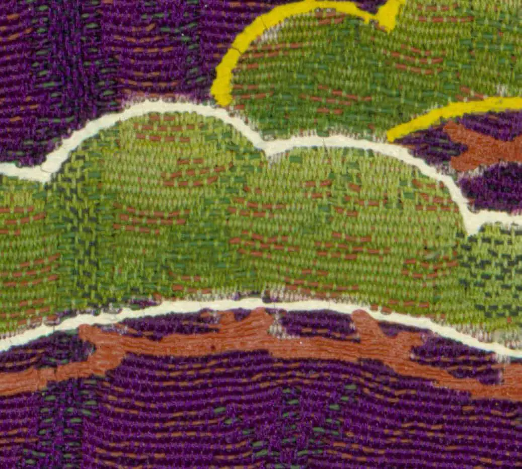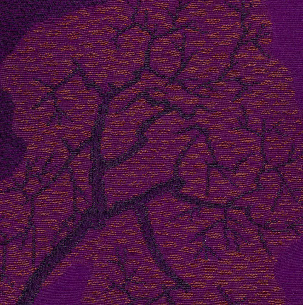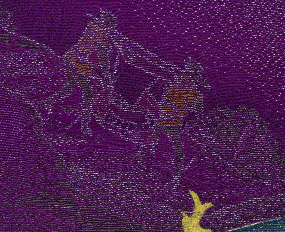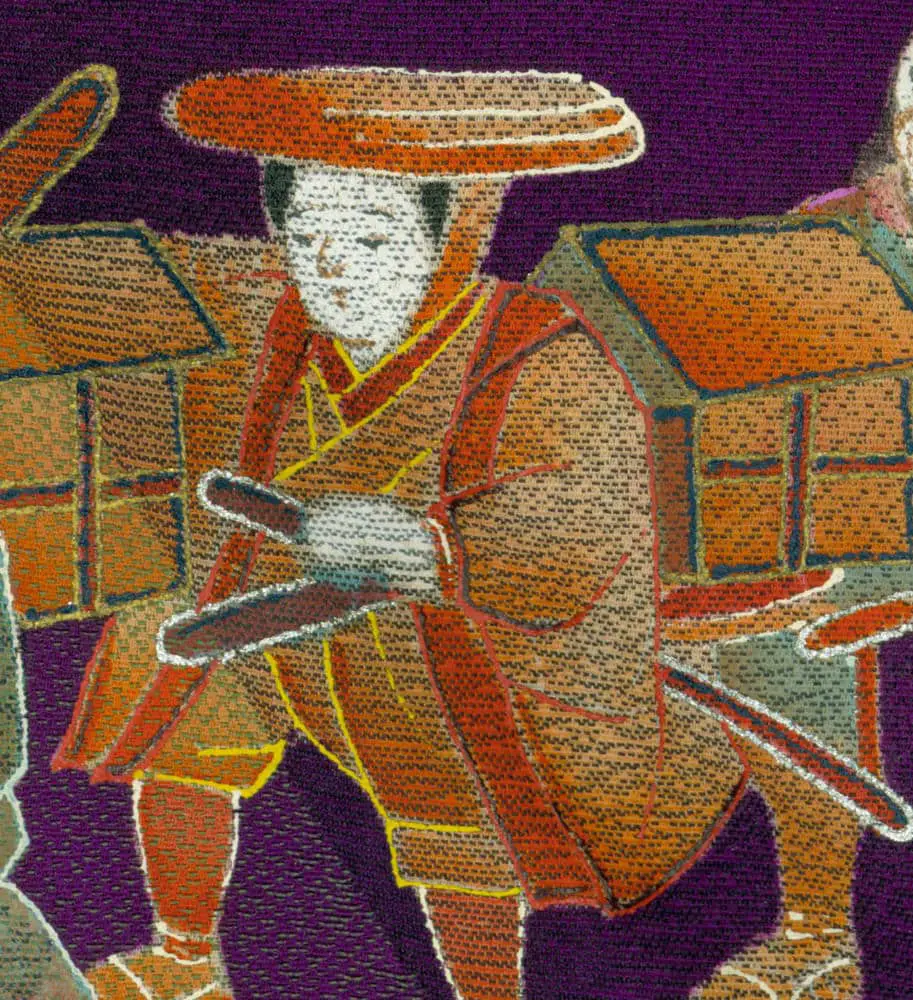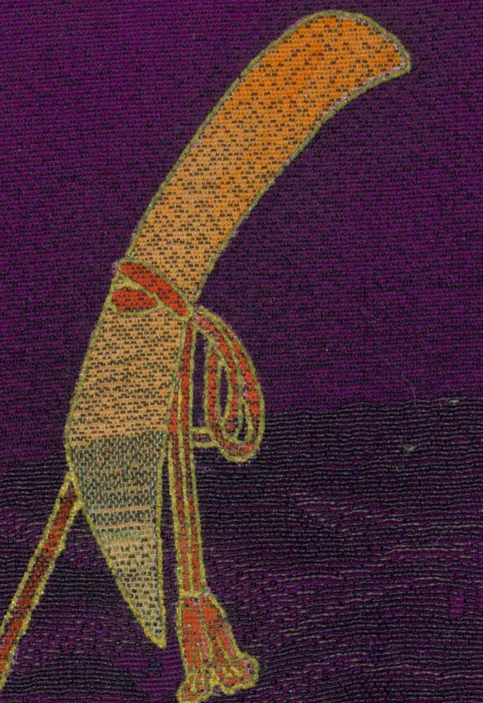 The background's flowing cloud patterns, created with woven urushi-coated threads that shimmer subtly against the deep purple silk, evoke the classical yamato-e painting tradition while adding textural richness. These stylized clouds serve both decorative and symbolic functions, representing the transient nature of worldly power and the ethereal realm between earth and heaven. The overall aesthetic demonstrates the continued vitality of traditional Japanese artistic principles during the early 20th century, when such historical themes provided cultural anchoring amid rapid modernization. The sophisticated interplay of weaving and dyeing techniques creates a textile that functions simultaneously as wearable art and historical document, embodying the Japanese aesthetic principle of finding profound beauty in the intersection of craft, narrative, and symbolic meaning.