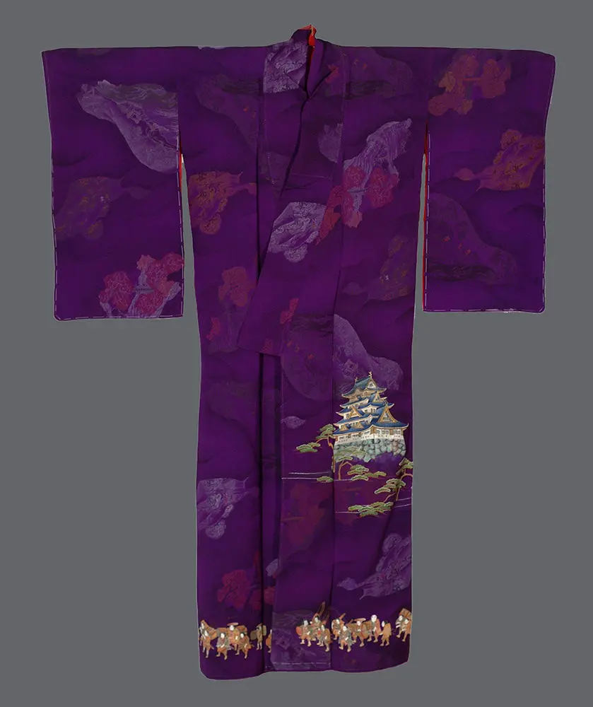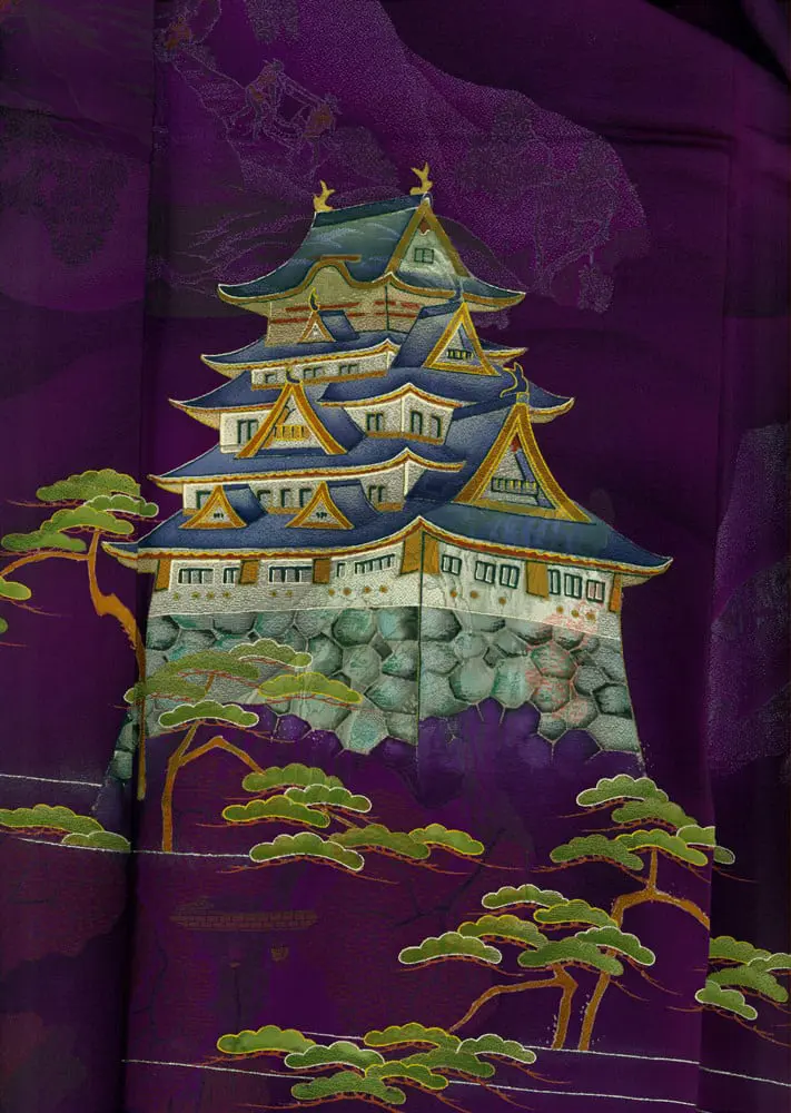 This unusual silk kimono presents a masterful depiction of a daimyo procession to Edo Castle, rendered through sophisticated Japanese textile techniques that create a visual narrative of profound historical and cultural significance. The composition unfolds across the garment's surface like a painted scroll, with the majestic multi-tiered castle serving as the central architectural focal point, its blue-gray roofs and golden accents rising dramatically against the rich purple ground. The castle itself symbolizes political power and the centralized authority of the Tokugawa shogunate, while its prominent placement speaks to the importance of Edo (modern Tokyo) as the seat of power.