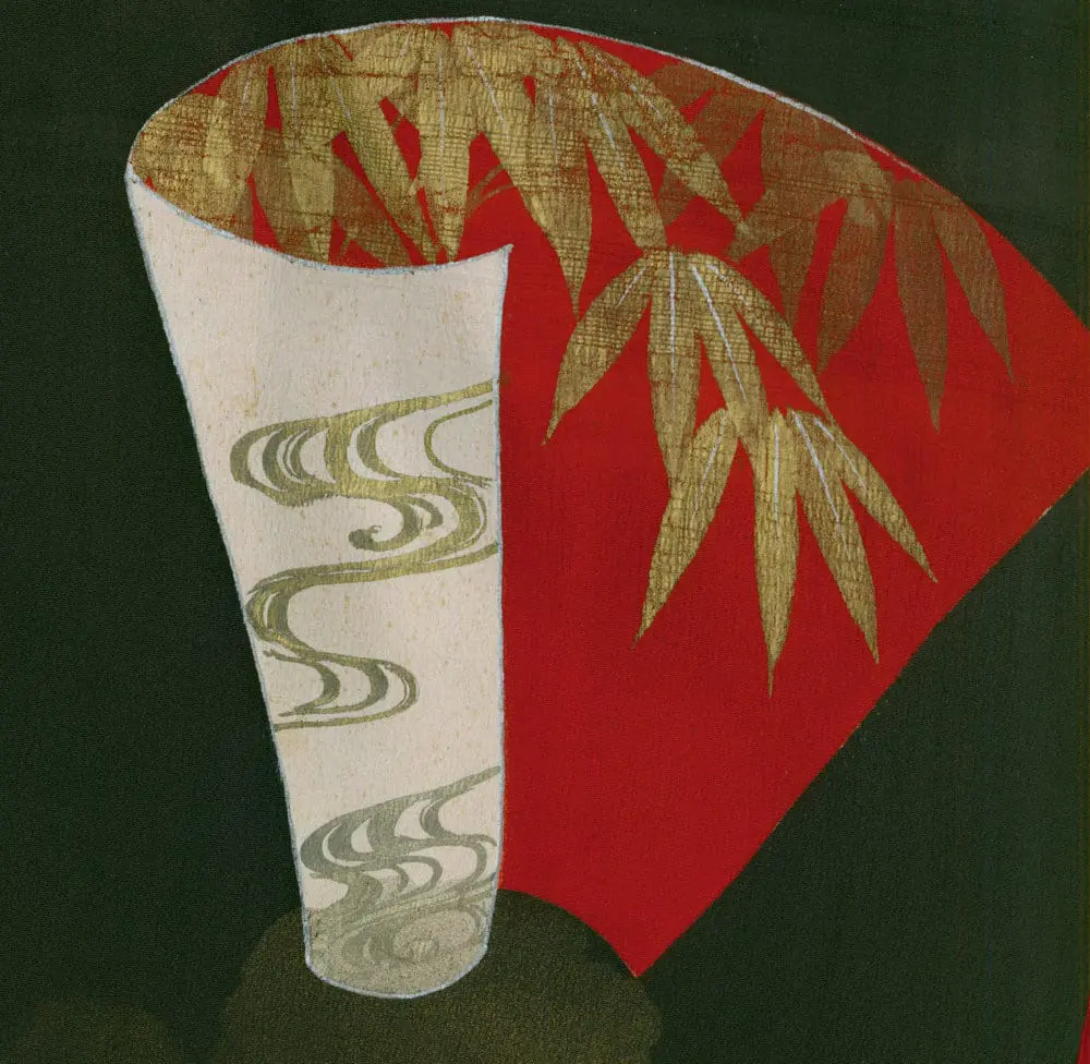 Each fan is meticulously individualized through hand-painting techniques, with vibrant colors including deep reds, soft greens, warm oranges, and rich blues. The incorporation of gold foil adds luminous accents that catch light and create visual depth, a technique that became increasingly refined during this period of Japan's modernization. The fans themselves display various decorative motifs, from delicate floral patterns to geometric designs, each rendered with the precision characteristic of master craftsmen working in the yuzen tradition.