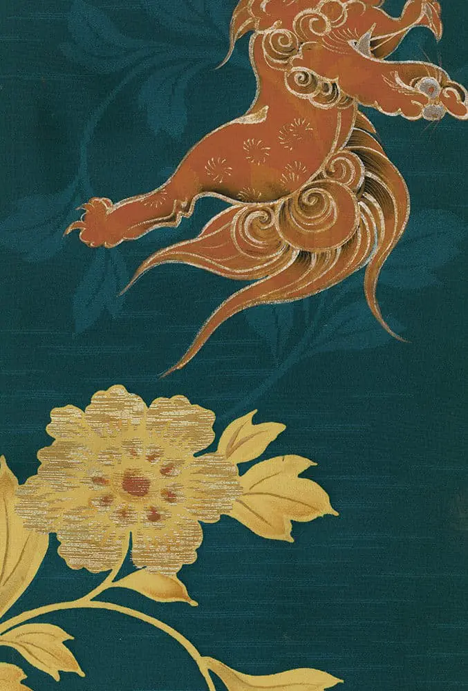 The lions, rendered in warm orange and rust tones, are depicted with flowing manes and dynamic poses that convey both strength and movement. Each lion is individually hand-painted without the use of stencils, showcasing the artist's skill in creating subtle variations within a cohesive design. The karahana flowers, stylized blooms of Chinese origin that became integral to Japanese decorative vocabulary, appear in golden yellow with some incorporating red accents and metallic silver threads woven horizontally into the silk. These metallic elements catch and reflect light, adding depth and luminosity to the overall composition.