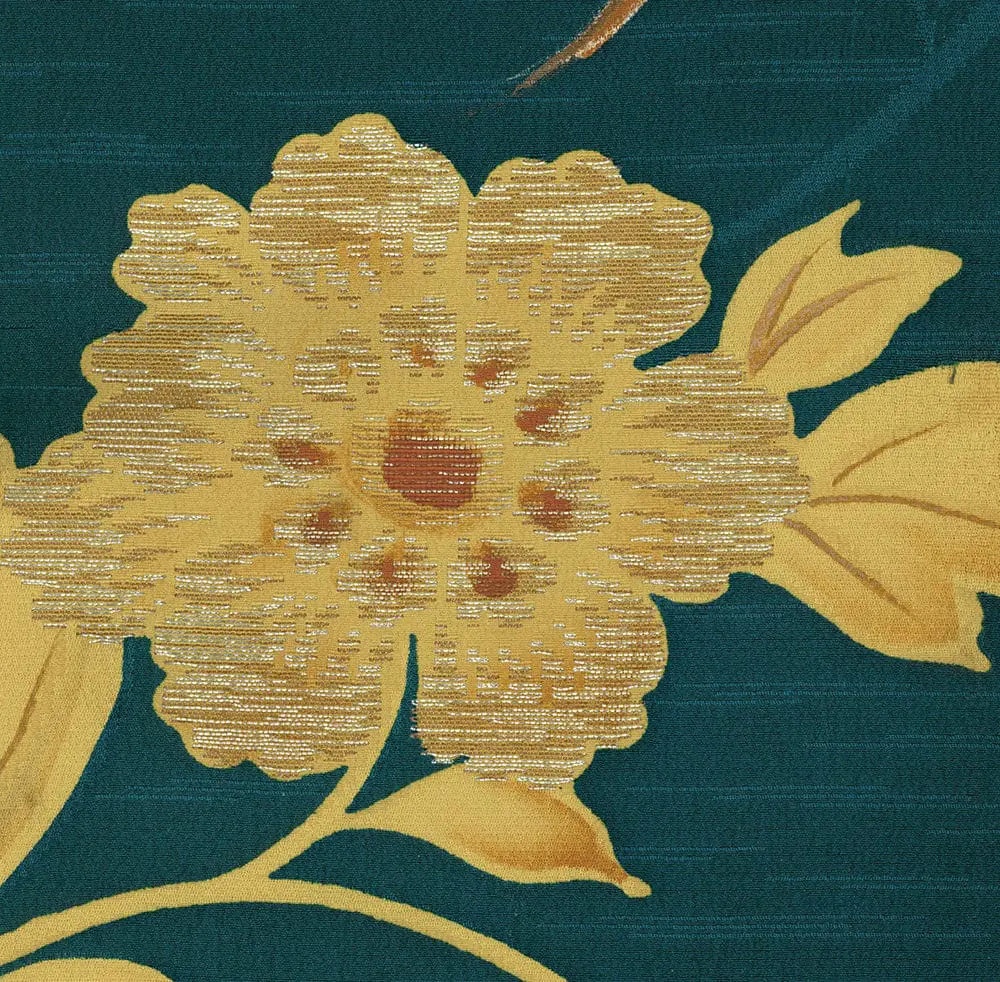 This silk kimono showcases the refined artistry of yuzen dyeing combined with freehand painting, creating a luxurious textile that exemplifies traditional Japanese decorative arts. The rich teal-green rinzu silk serves as a sumptuous backdrop for an elaborate pattern of karahana flowers and fierce lions, motifs that demonstrate the Japanese aesthetic principle of combining natural beauty with symbolic power.