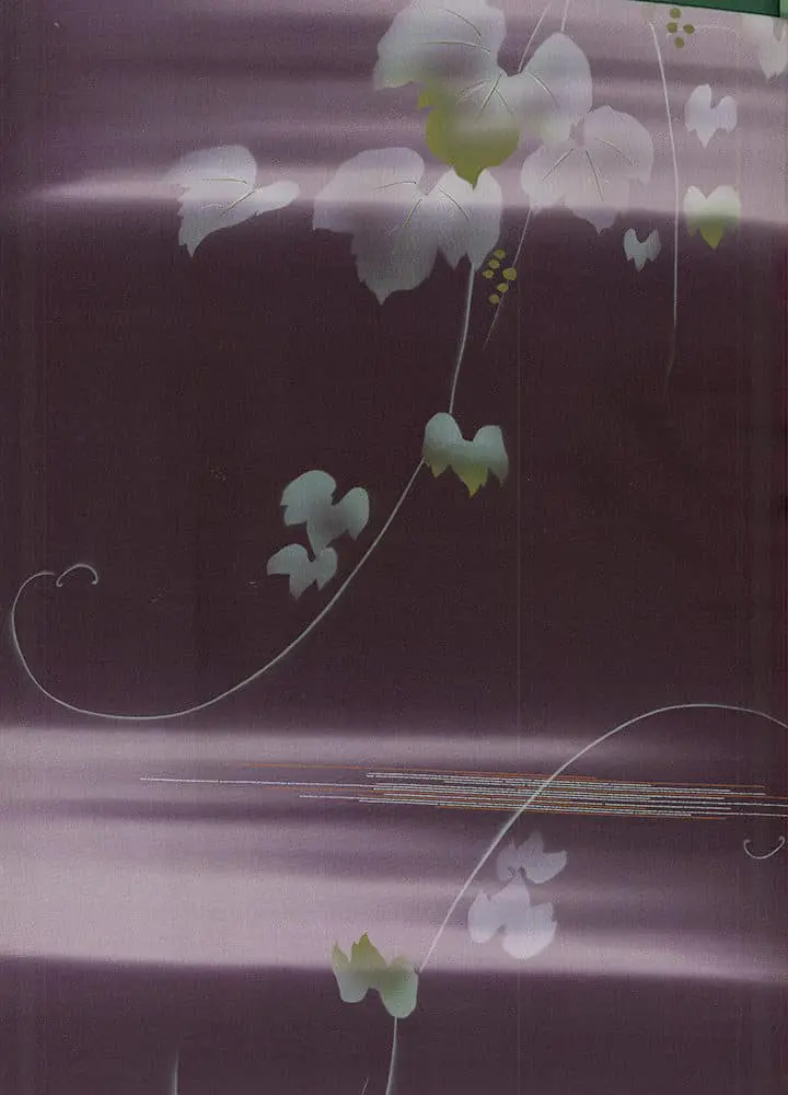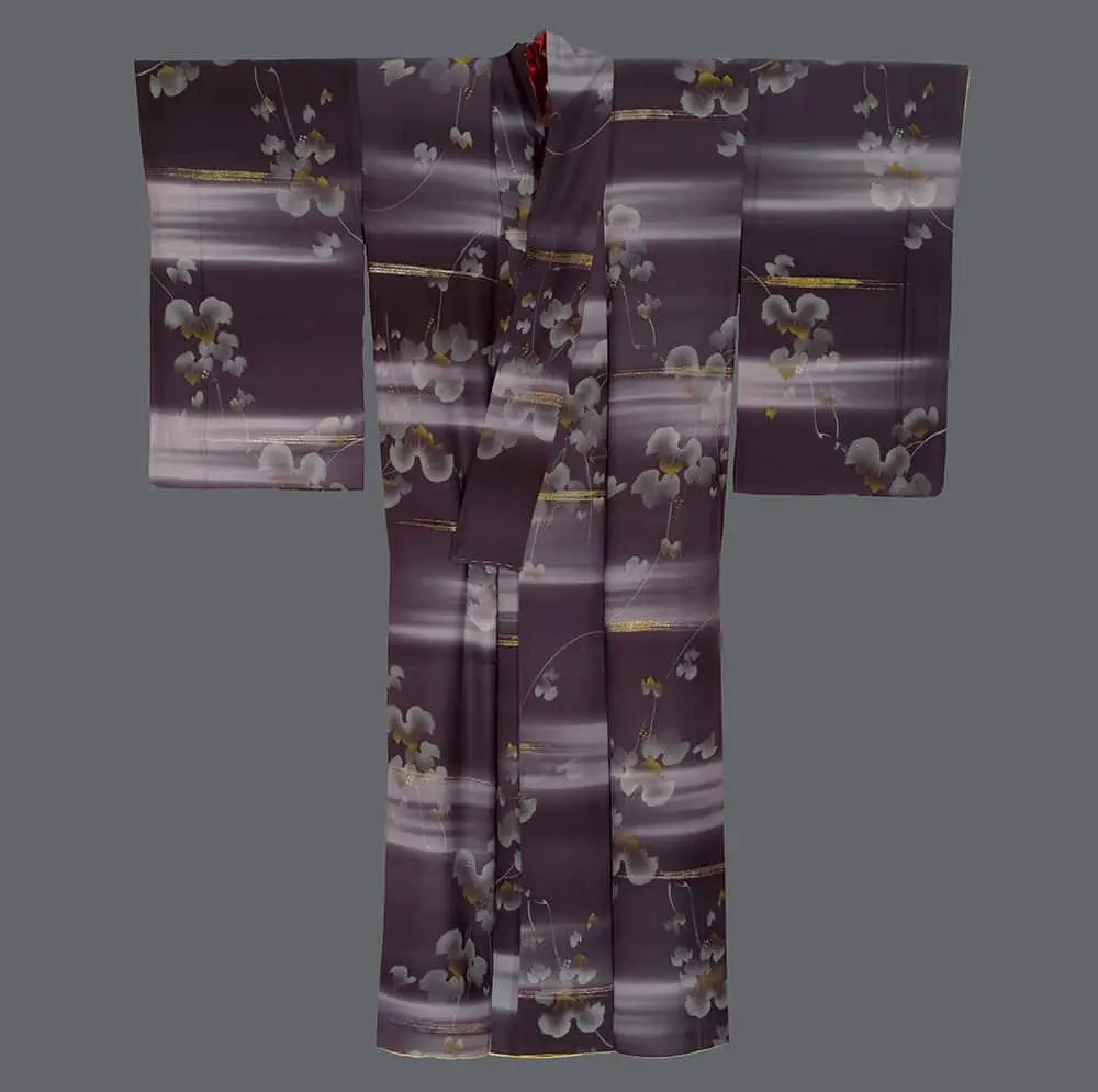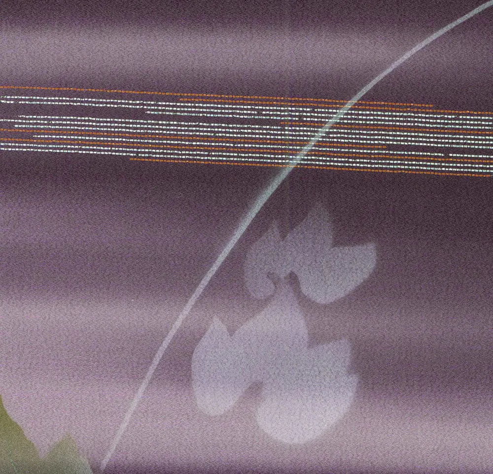 This sophisticated kimono exemplifies the revolutionary impact of silkscreen printing technology on Japanese textile design, combining traditional floral motifs with modernist compositional strategies that reflect the influence of Art Deco and contemporary graphic design movements. The garment features a complex interplay of horizontal metallic thread inserts that create shimmering bands across a rich burgundy ground, punctuated by delicate cherry blossoms (sakura) rendered in subtle gradations of white and pale yellow. The silkscreen technique allows for remarkably precise registration and smooth color transitions, creating an almost photographic quality in the floral imagery that contrasts dramatically with the geometric precision of the metallic striping.