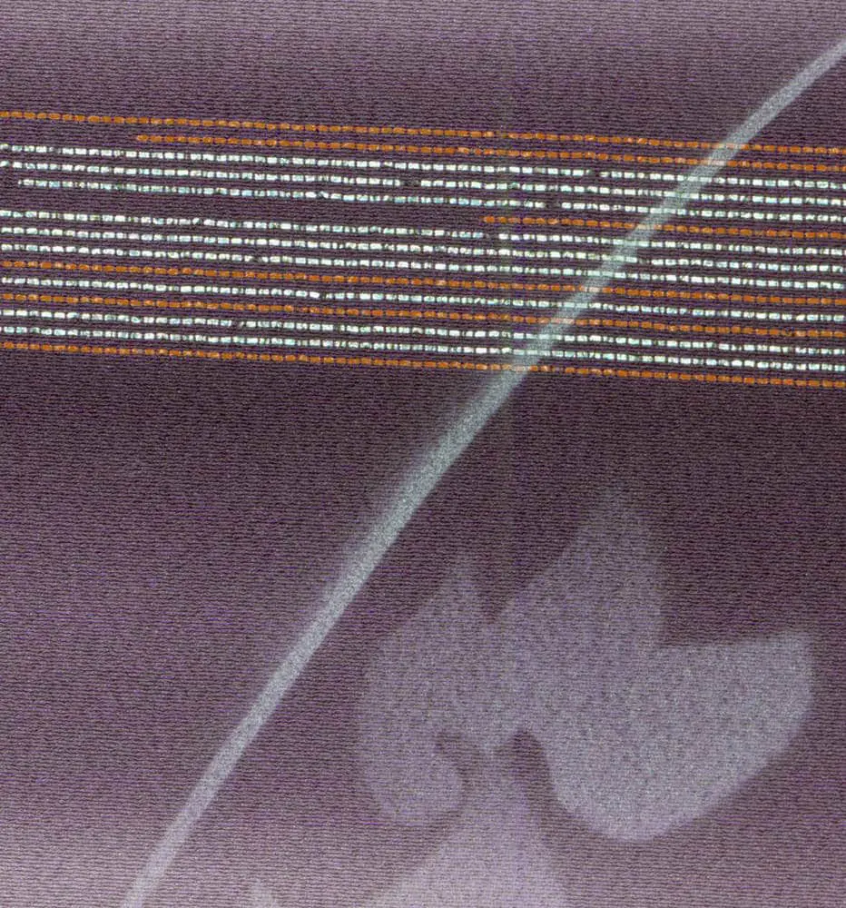 The technical execution demonstrates the sophisticated capabilities of silkscreen printing when combined with traditional Japanese weaving expertise, as evidenced by the seamless integration of the metallic thread inserts within the printed design. This hybrid approach reflects Japan's embrace of industrial innovation during the interwar period, when traditional craft industries were adapting new technologies to create textiles that maintained cultural authenticity while appealing to increasingly cosmopolitan tastes.