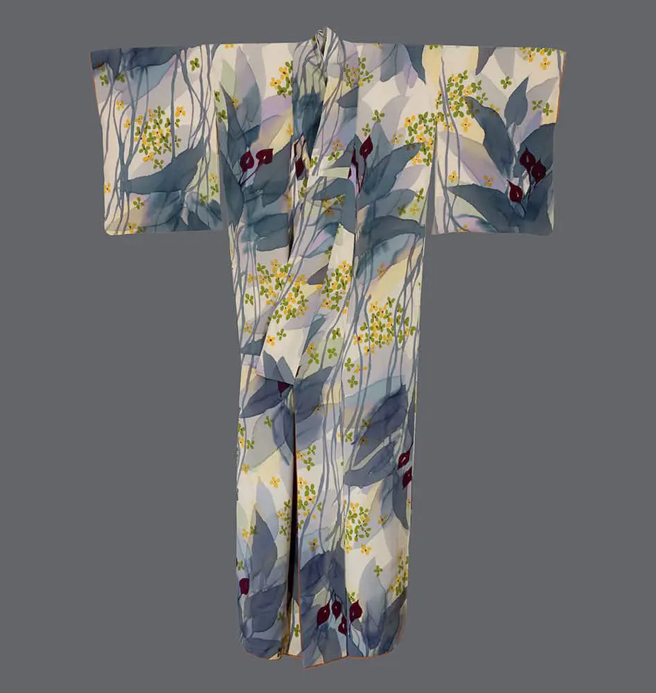 It boasts a hiro-eri (unfolded collar) and measures 61 inches (155 cm) from sleeve-end to sleeve-end, with a height of 66 inches (168 cm).