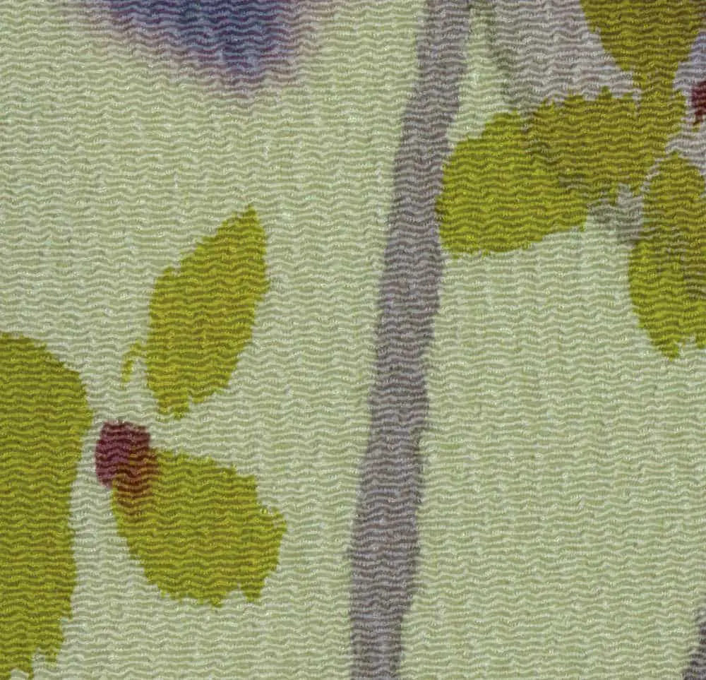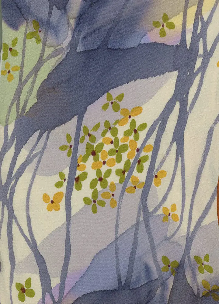 However, the close-up details reveal the brilliant technical innovation of this piece. The chirimen silk's exceptionally twisted threads create a distinctive wavy, rippled texture that transforms the naturalistic imagery into something approaching Op Art or Kinetic Art effects. The crinkled surface causes the botanical motifs to appear to shimmer and vibrate.