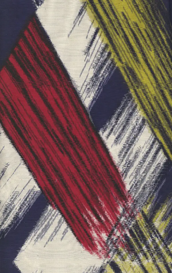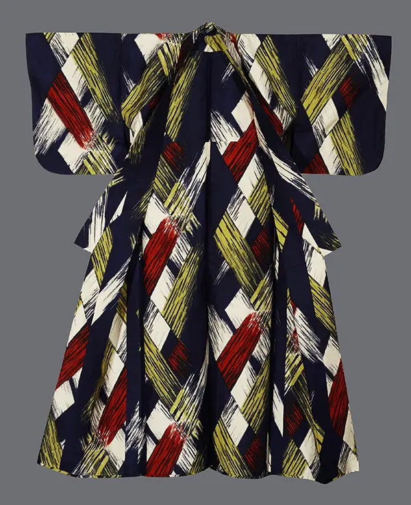 This meisen kimono exemplifies the bold modernist aesthetic that revolutionized Japanese textile design in the early-to-mid 20th century. The composition employs a dynamic diagonal motif that creates a sense of movement and energy across the entire garment surface.