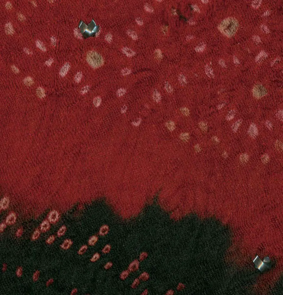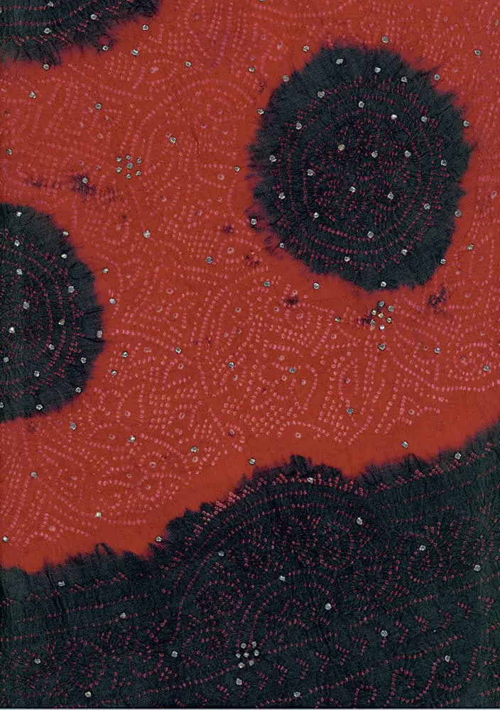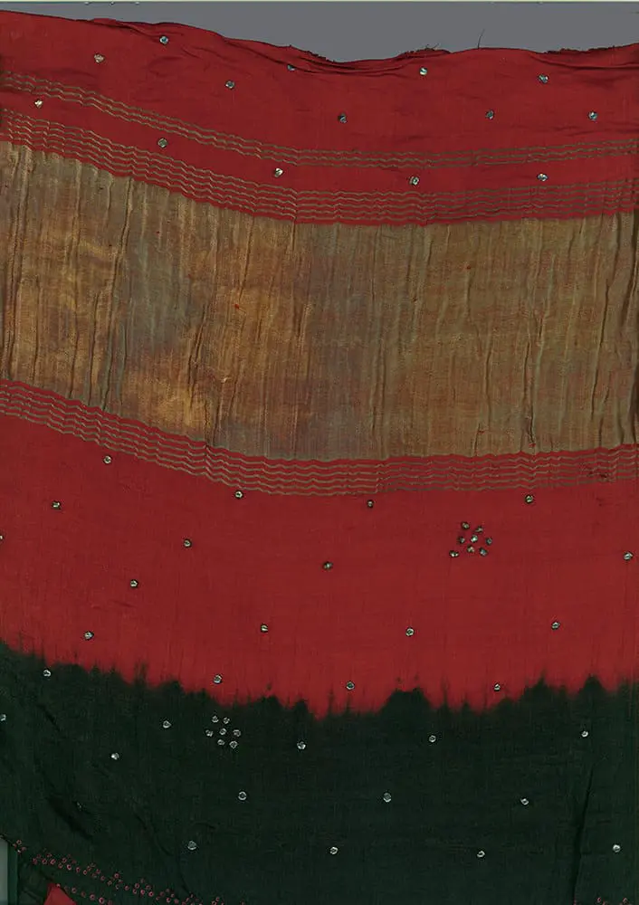 This exquisite wedding shawl, crafted from fine silk, hails from southern Pakistan, featuring intricate tie-dye and delicate embroidery. The meticulous tie-dye and embroidery work showcase remarkable craftsmanship and aesthetics. The shawl is constructed from two halves joined by a broad band of metallic embroidery, exhibiting great attention to detail. Measuring 62 inches by 64 inches (157 cm x 163 cm), it remains in very good condition.