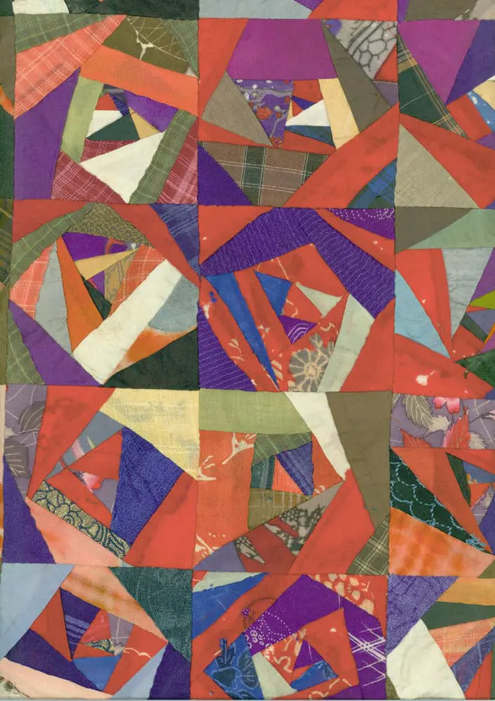 This unique uchishiki is crafted from a patchwork of silk and wool from previous garments, accompanied by a cotton lining. Despite showing overall wear typical of its age and use, it remains in good condition. It measures 40 inches by 59 inches (101.5 cm x 150 cm).