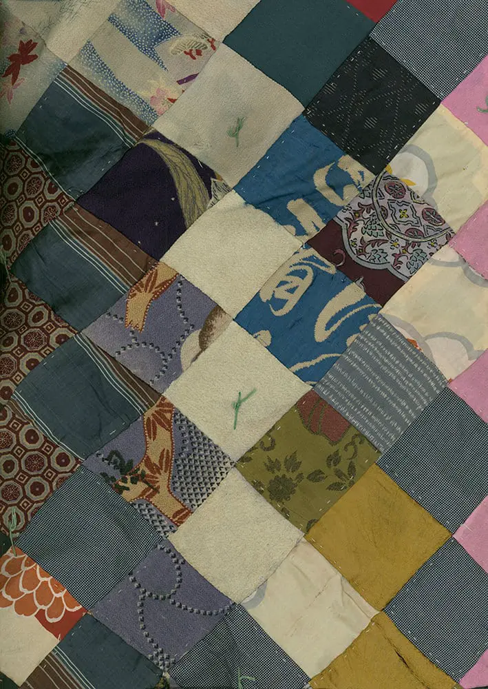 This panel is a rare composition of fine Edo-period silks and cottons, assembled akin to older Western quilts on a lining. Overall, it's in very good condition but does exhibit numerous small imperfections. Its dimensions measure approximately 57 inches by 60 inches, or about 145 centimeters by 152 centimeters.