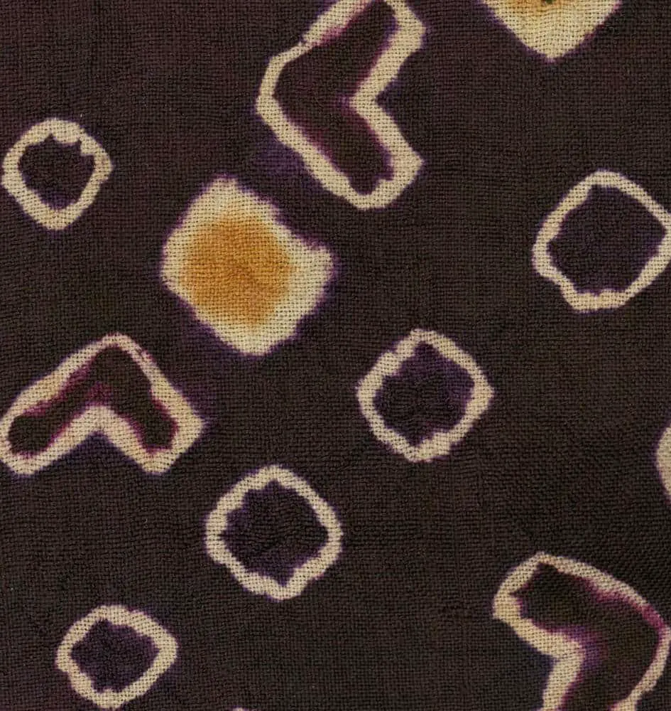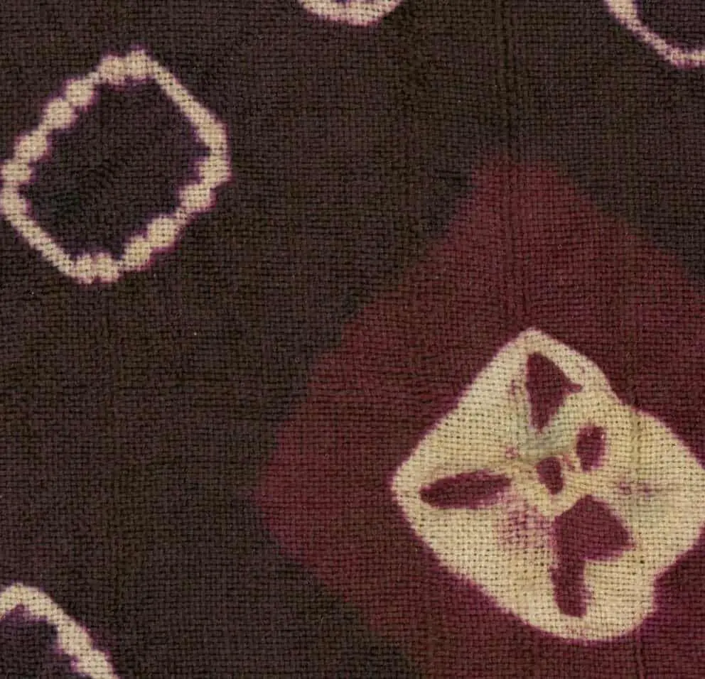 This exquisite antique silk plangi breast wrapper showcases broad asymmetrical bands dyed in deep violet, vermillion, maroon, and light brown. The elegant, traditional pattern features an intensity of color remarkable for natural dyes. It remains in excellent condition, displaying signs of light wear, including two tiny holes. Its measurements are 70 inches by 18 inches (178 cm x 46 cm).