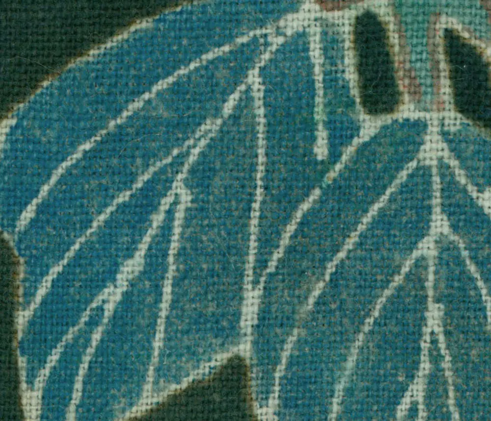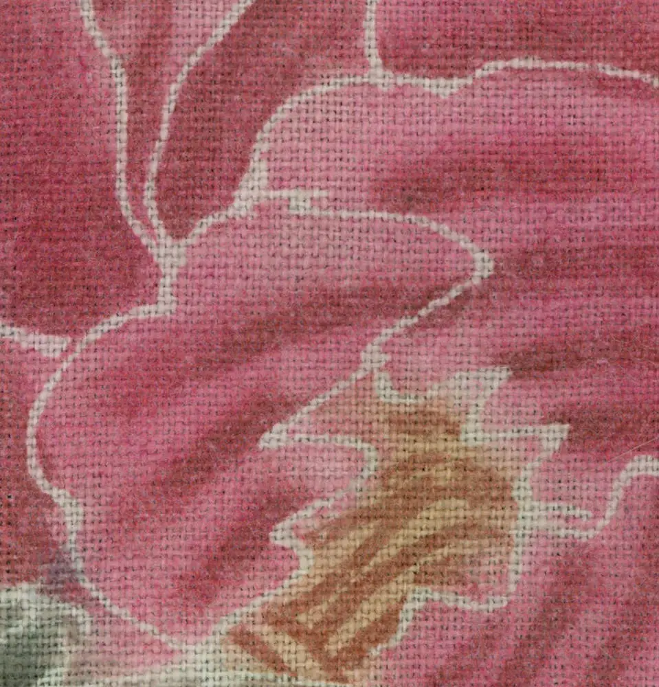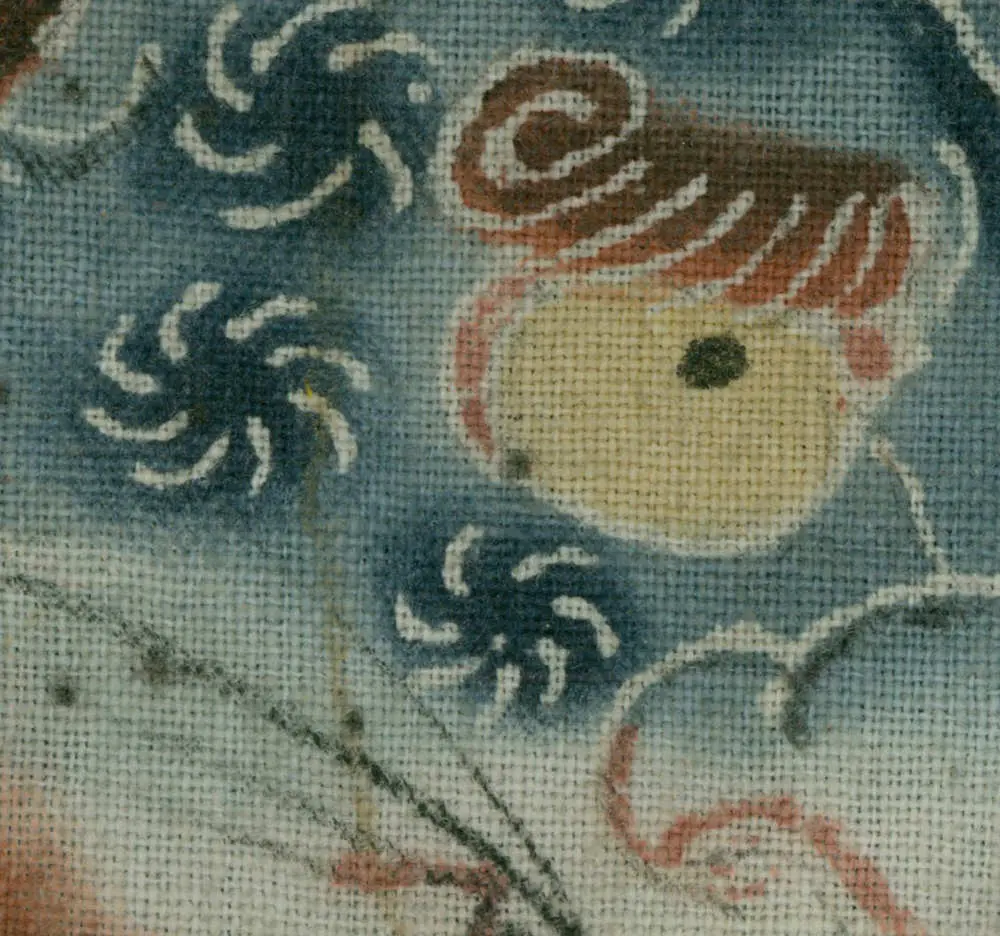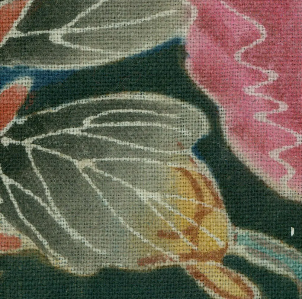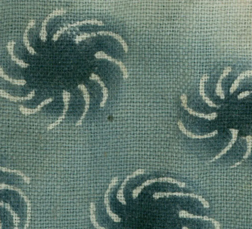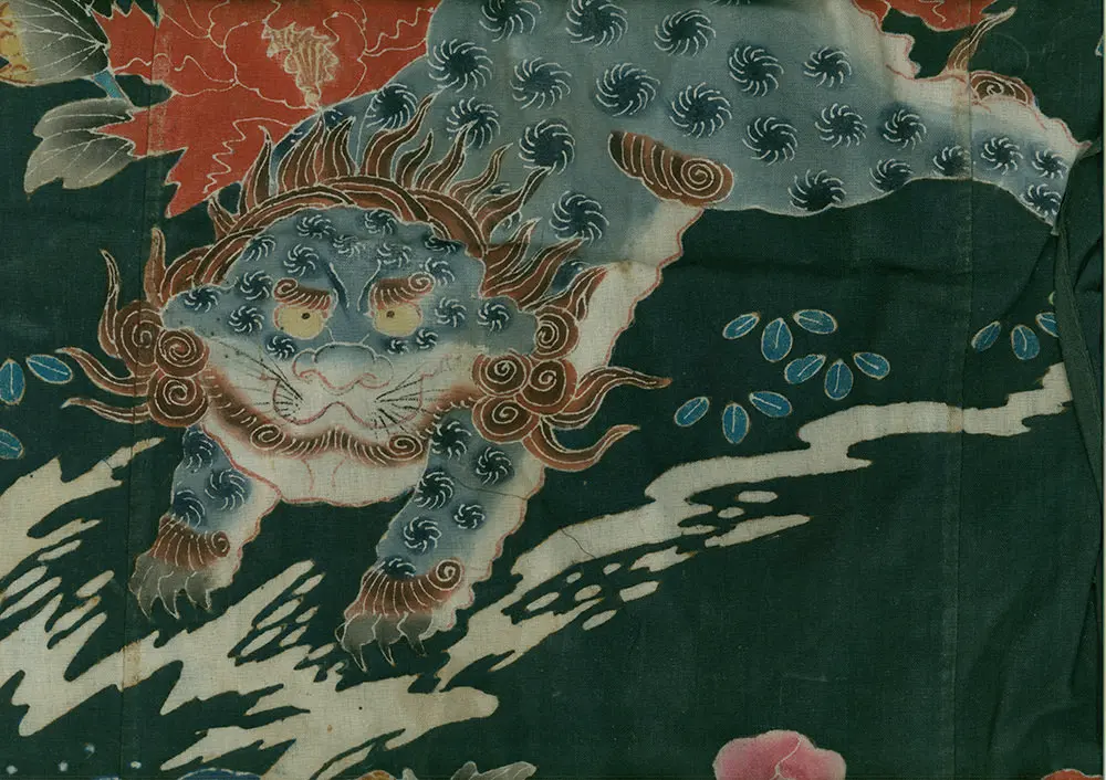 This hand-spun, hand-woven matrimonial blanket in plain-weave cotton is a traditional tsutsugaki piece. It features a motif combining a Chinese lion and peonies, commonly found on wedding bed covers. In Japanese culture, lions and peonies have deep-rooted associations with Buddhism, possibly linked to the Noh drama 'Stone Bridge,' where a lion energetically dances among peony blossoms, symbolizing longevity and a prosperous life.