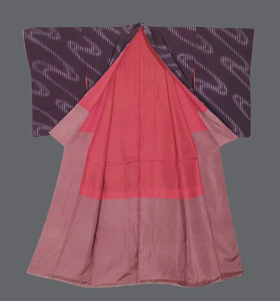 This kimono displays a sophisticated ikat-inspired pattern executed through silk-screening technology, demonstrating how Japanese artisans were adapting industrial printing methods to achieve effects previously only possible through labor-intensive resist-dyeing techniques. The rich burgundy ground provides a luxurious foundation for the rhythmic pattern of white linear elements that create an optical sense of movement and depth across the textile's surface.