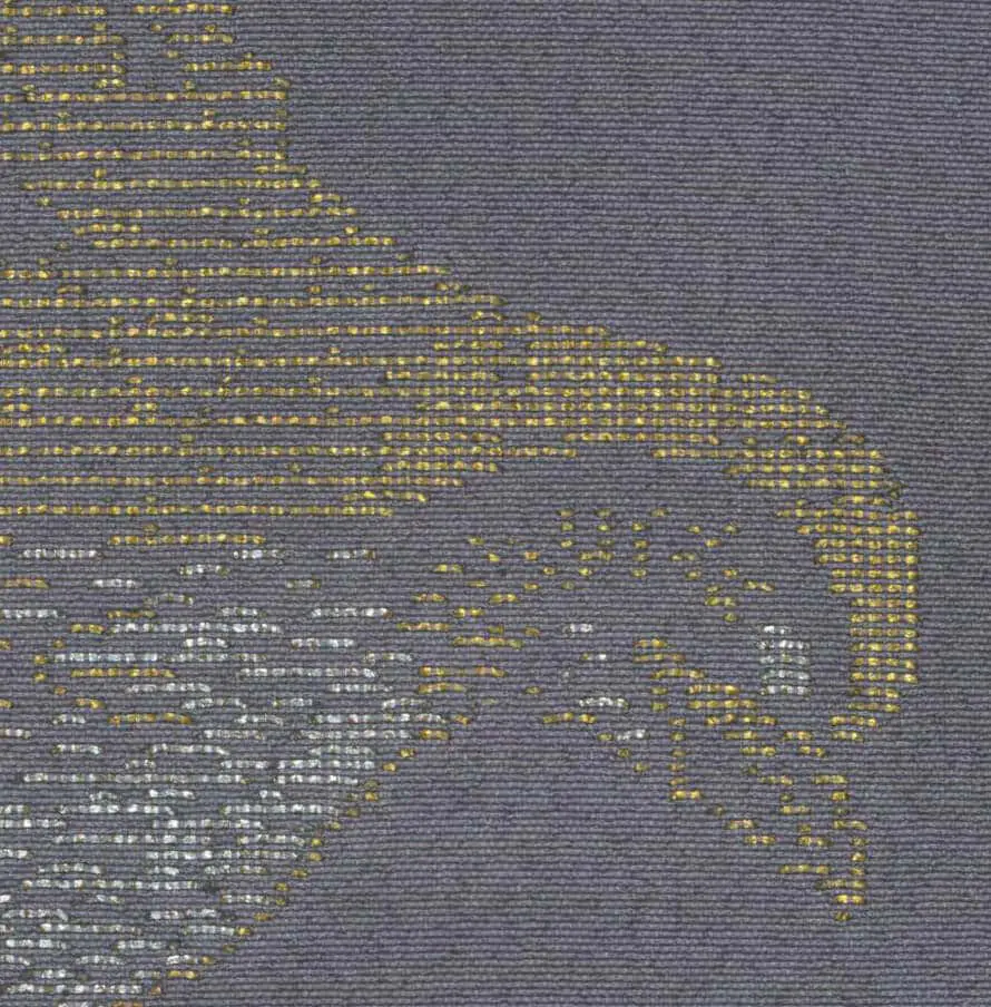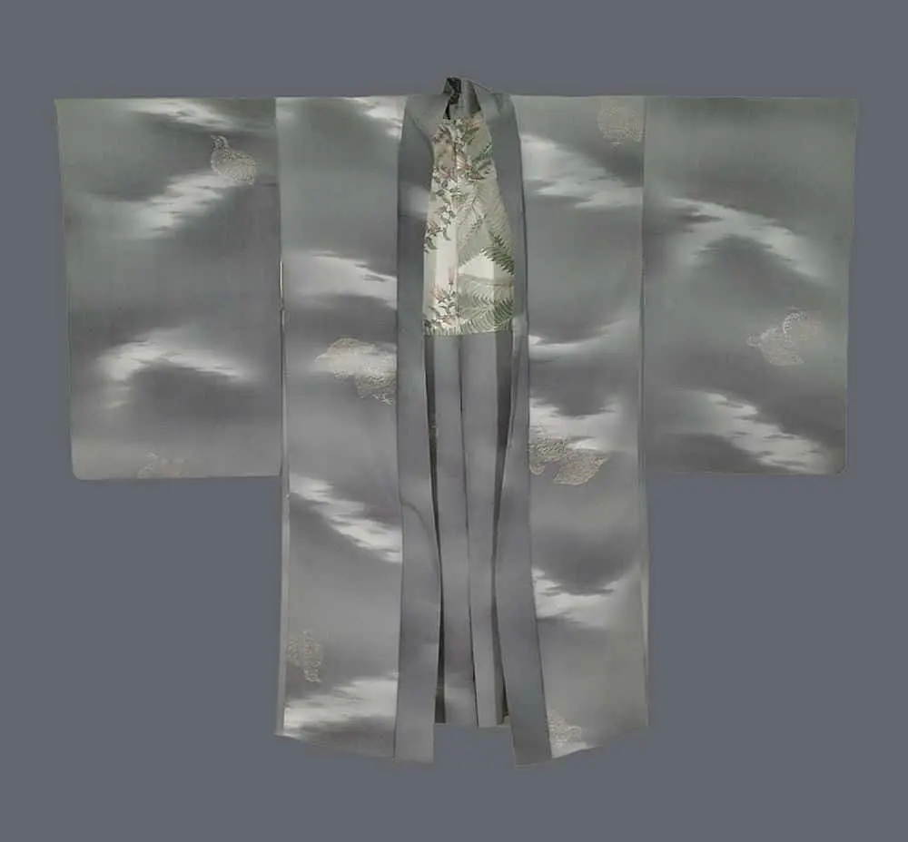 Serene beauty and understated elegance emerge through the depiction of stylized quails amidst a hazy, dreamlike landscape. Rendered in subtle shades of grey, white, and gold against a muted blue-grey ground, the design captures the essence of these delicate birds in their natural habitat. The quails, rendered in gold and silver with intricate detailing, appear almost hidden within the swirling patterns of the background, creating a sense of mystery and intrigue. The overall aesthetic suggests a connection to traditional Japanese ink painting techniques, with their emphasis on capturing the essence of nature through subtle gradations of tone and minimalist compositions. The restrained color palette and the delicate rendering of the motifs create a sense of serenity and quietude, reminiscent of the Japanese aesthetic of wabi-sabi, which finds beauty in imperfection and impermanence. The hazy, cloud-like patterns in the background contribute to the dreamlike atmosphere of the design. These patterns, reminiscent of traditional Japanese landscape paintings, evoke a sense of vastness and tranquility. The placement of the quails within this hazy landscape further enhances the sense of mystery and invites contemplation.