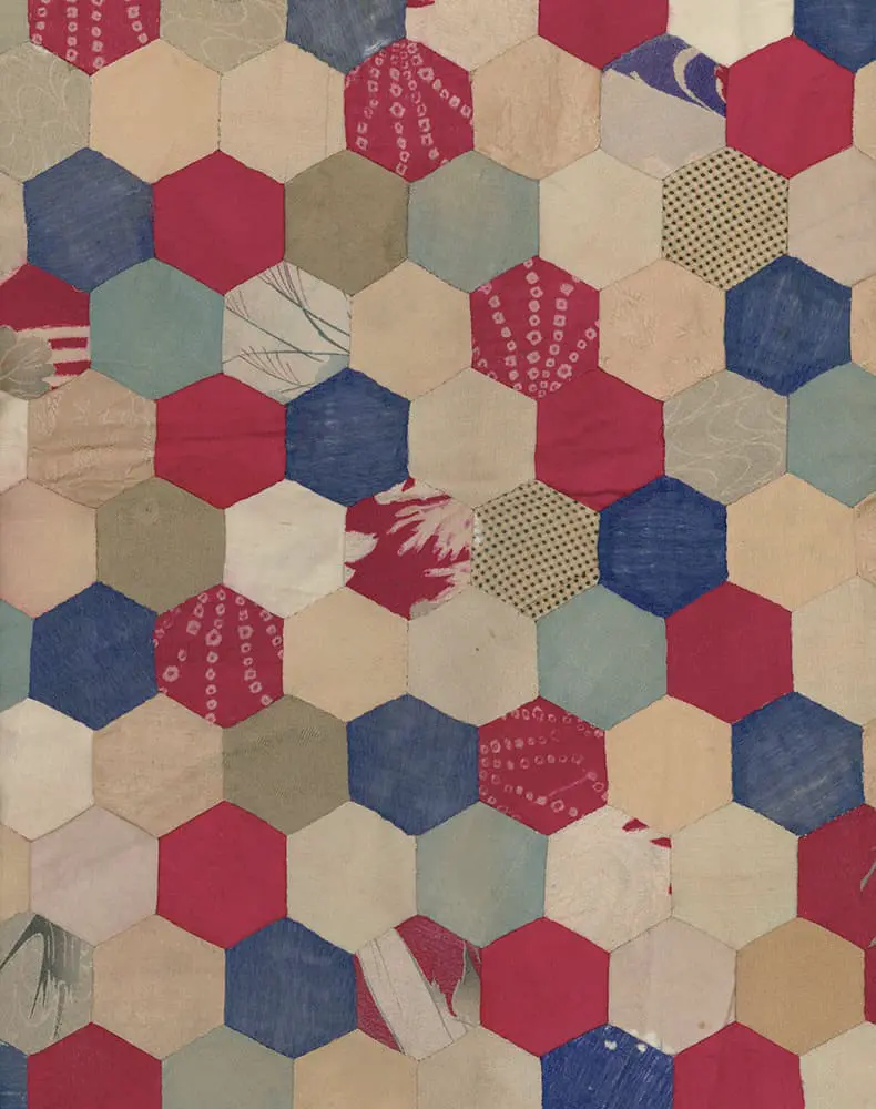 This unusual uchishiki temple cloth displays a colorful tortoise-shell pattern created through patchwork, reminiscent of a North American quilt. The patchwork comprises various chirimen and kinsha silk fabrics, with each hexagonal piece sourced from the clothes of 'Chiyoko Nakagawa' and her family members. Chiyoko Nakagawa dedicatedly crafted this cloth, aiming to secure happiness for her family.