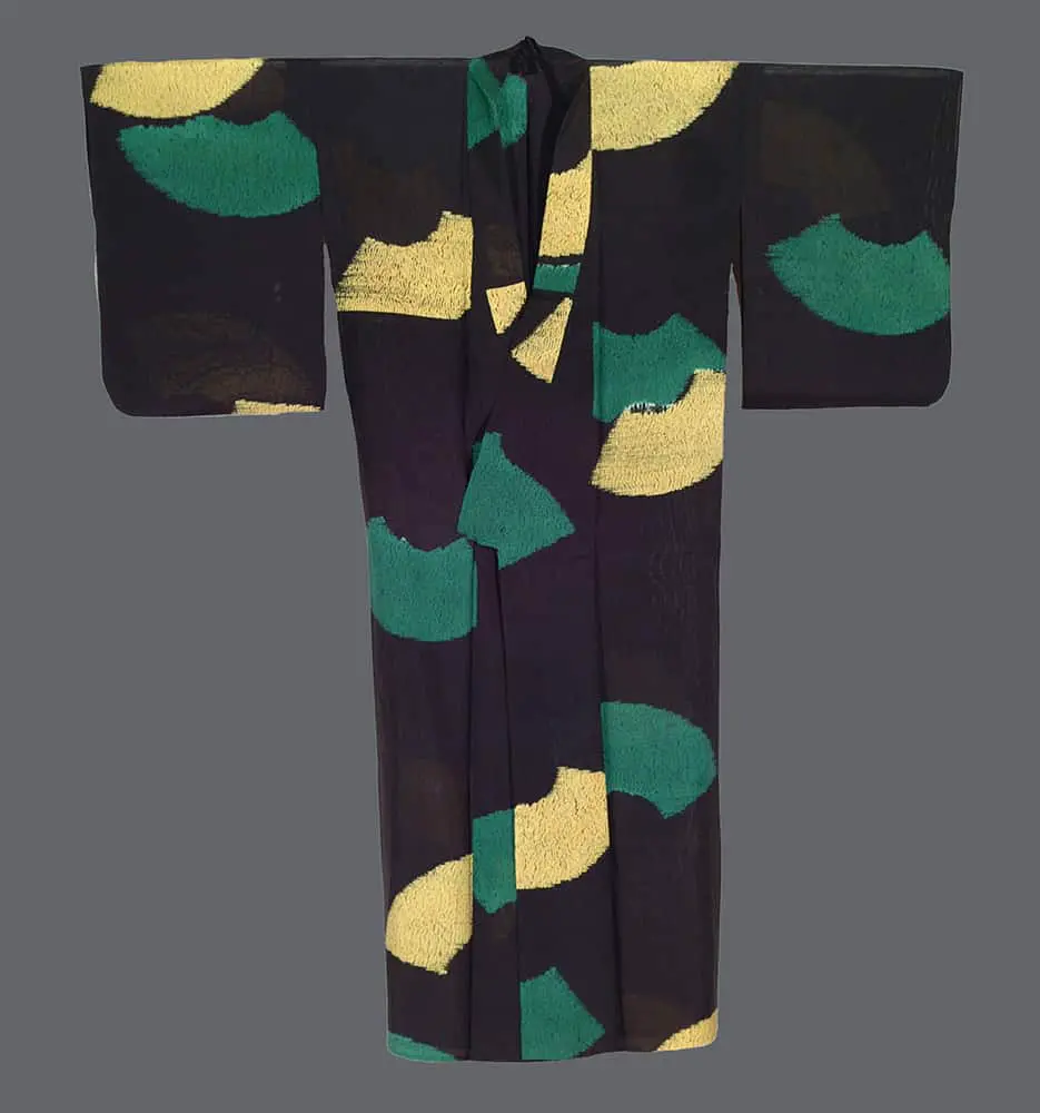 This ra silk kimono features boldly abstracted fan motifs (sensu) rendered in vibrant emerald green and golden yellow against a deep charcoal ground, creating a dramatic tonal contrast that speaks to the influence of contemporary Art Deco sensibilities on traditional Japanese craftsmanship. The fans appear as large, irregular semicircular forms scattered across the kimono's surface in an apparently random yet carefully balanced composition that suggests the kind of asymmetrical dynamism favored by modernist designers of the era.
