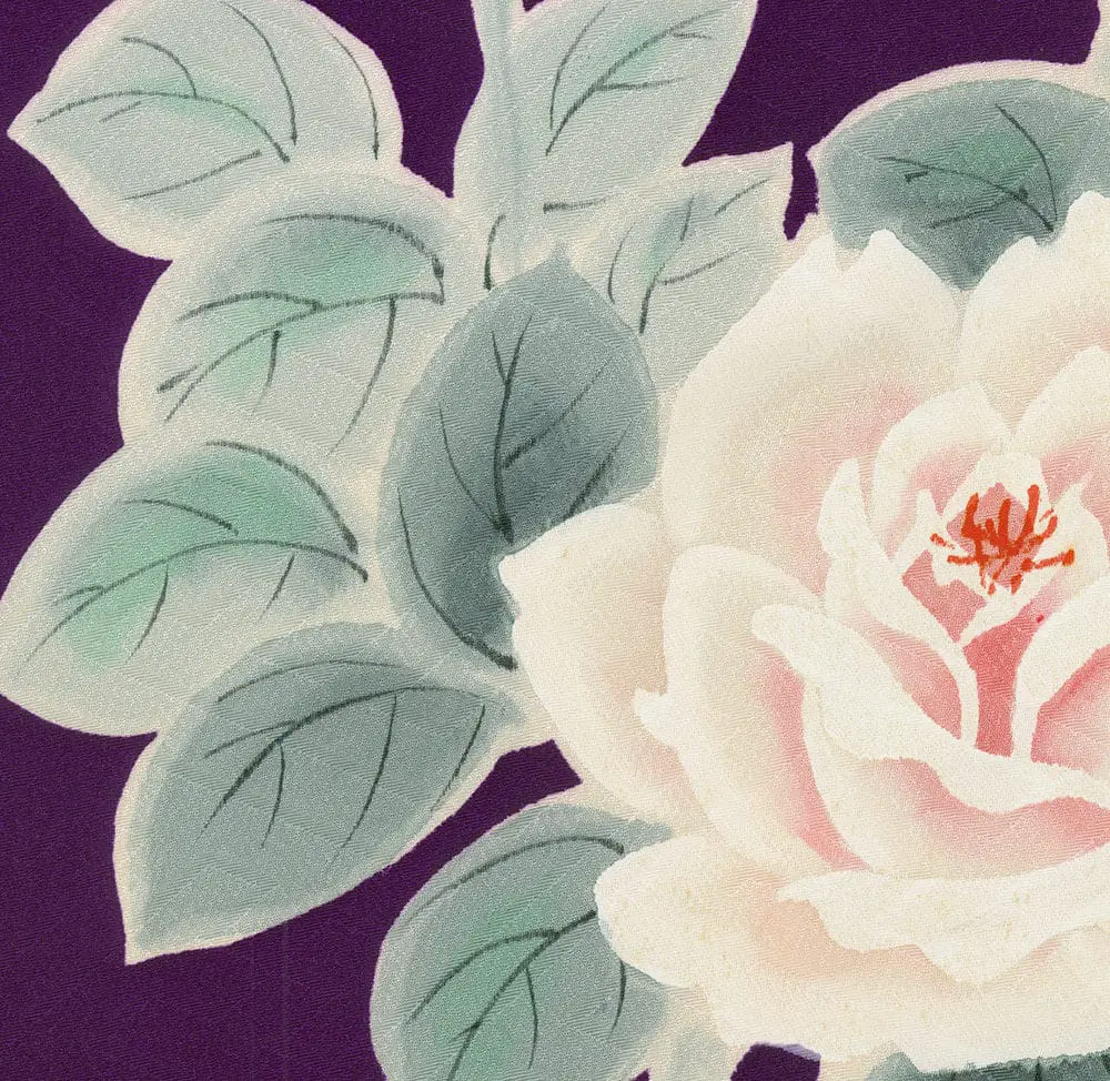 This rinzu silk furisode presents a bold reinterpretation of Western floral motifs through the lens of Japanese textile artistry, creating a dramatic fusion of cultural aesthetics. The garment features meticulously hand-painted roses rendered in soft blush pink and cream tones against a rich royal purple ground, with delicate sage green foliage providing naturalistic detail. The roses are depicted in various stages of bloom, from tight buds to fully opened flowers, creating a sense of temporal progression and organic vitality that flows gracefully across the kimono's surface.