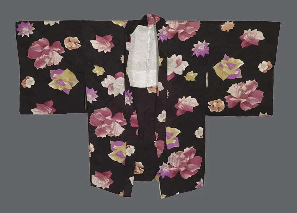 This rinzu silk haori features a sophisticated scattered composition of various blooms rendered in a rich palette of dusty roses, lavenders, golden yellows, and creams against a deep black damask ground. The flowers appear to float weightlessly across the surface, creating a sense of movement and spontaneity that reflects the period's embrace of artistic freedom after years of wartime restraint. The rinzu weaving technique adds subtle textural depth through its damask patterns, while the precise rendering of each individual bloom demonstrates advanced dyeing and printing capabilities that had been refined during Japan's rapid industrial modernization.