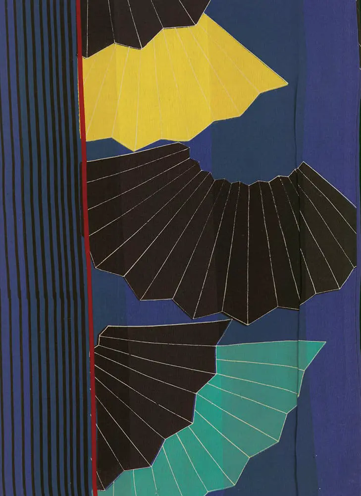 The alternating vertical stripes in two tones of blue create a sophisticated foundation that demonstrates the technical mastery of rinzu weaving. The optical effect achieved through the figured silk technique - where the same dye appears as different tones due to varying weave structures - adds dimensional depth without additional color complexity. These stripes function both as compositional anchors and as intervals of visual rest between the more dynamic fan elements.