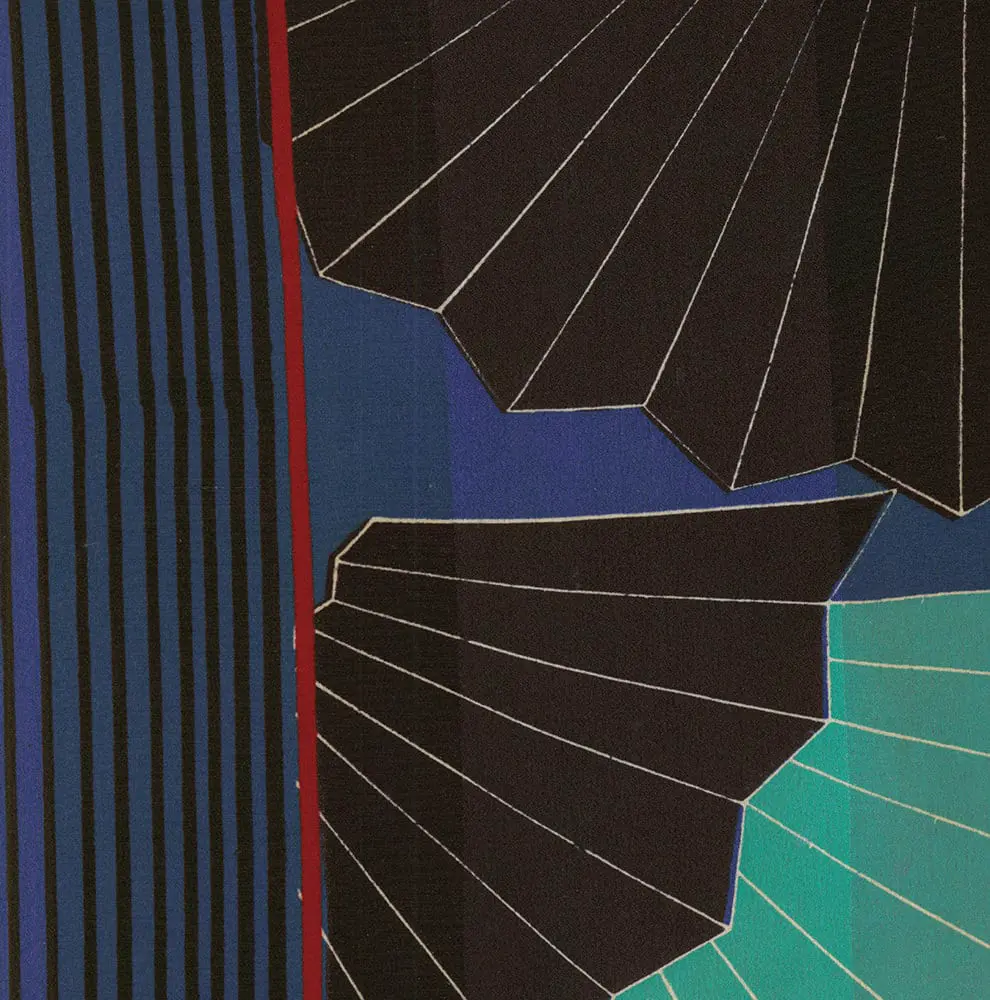 The artistic genius lies in the systematic deconstruction of the traditional fan form. Rather than presenting complete, recognizable fans, the design fragments them into geometric segments - arcs and triangular sections in vibrant turquoise, golden yellow, and black that appear to float and overlap across the composition. This fragmentation technique anticipates post-war abstract art movements while maintaining connection to Japanese cultural symbols.