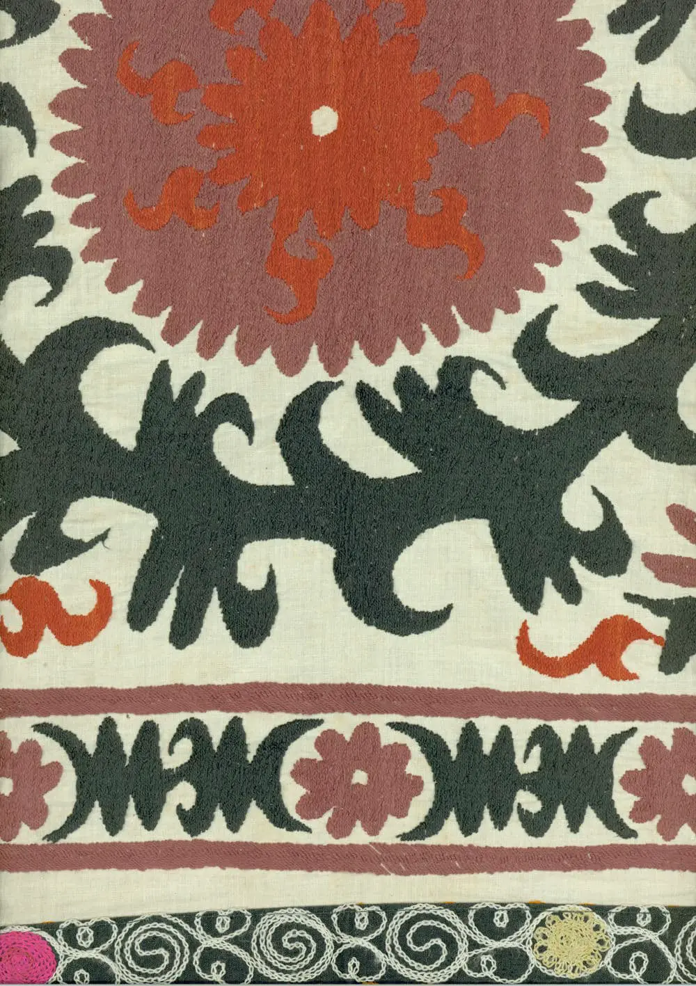 This cotton Samarkand Bolinpush, measuring 45 inches (114 cm) by 31 inches (79 cm), showcases exquisite hand-embroidery within the main design, accented by machine stitching along the edges.