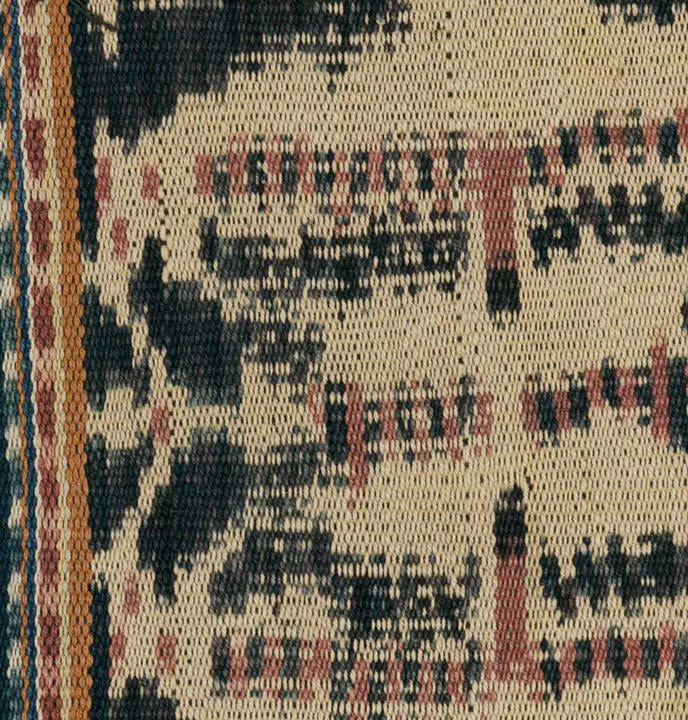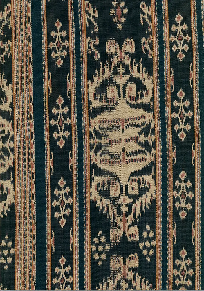This cotton warp-ikat selendang originates from Savu and was crafted by the greater Blossom clan, as documented in Fig 104 of 'Traditional Indonesian Textiles' by John Gillow. Renowned for its superior weaving, this textile boasts a luxurious and even handle. Notably, a section of the pattern appears to feature a woven date resembling '1328', potentially referring to a date in the Hijri (Islamic) calendar that corresponds to the year 1910 in the Gregorian calendar.