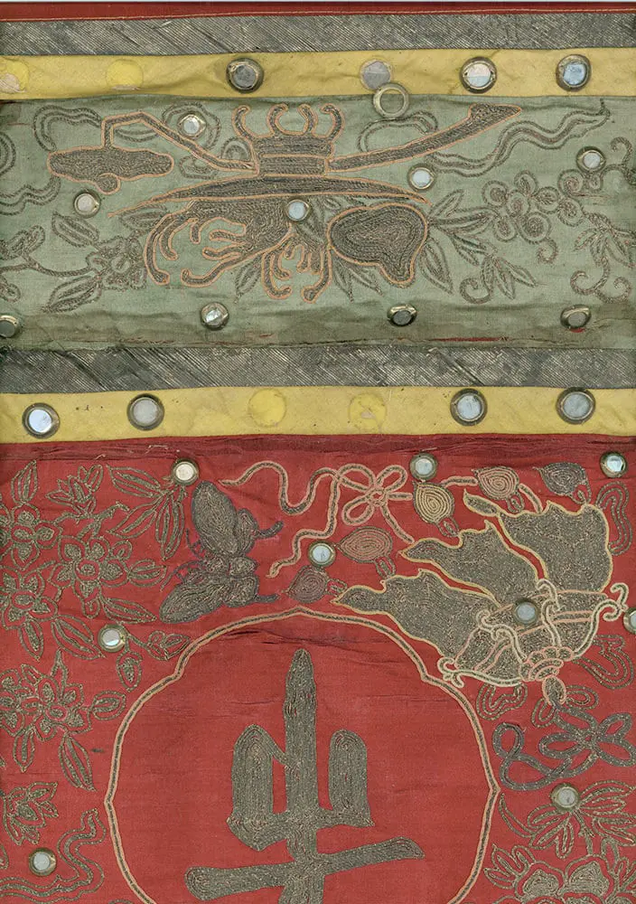 These Chinese temple banners, though exhibiting some missing metal discs and several minor imperfections, are in good condition overall. Each banner measures 104 inches by 17 inches (264 cm x 43 cm).
