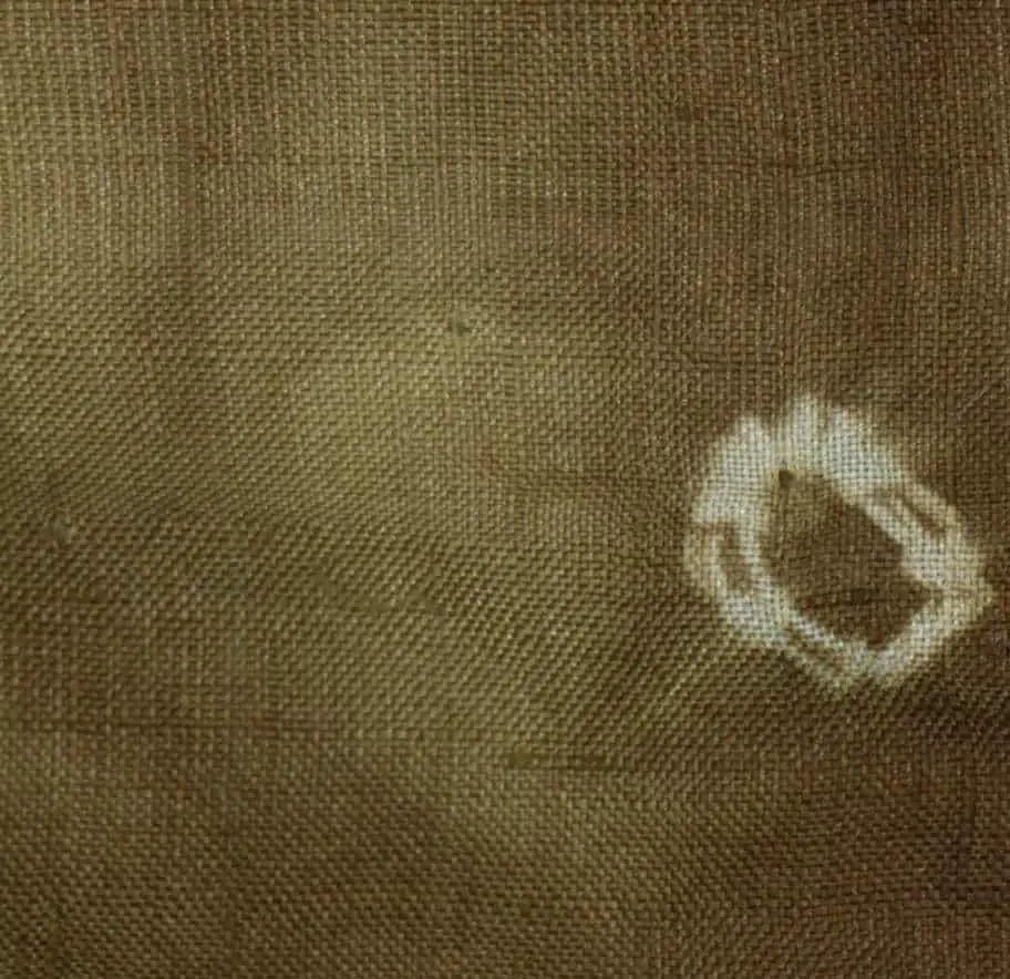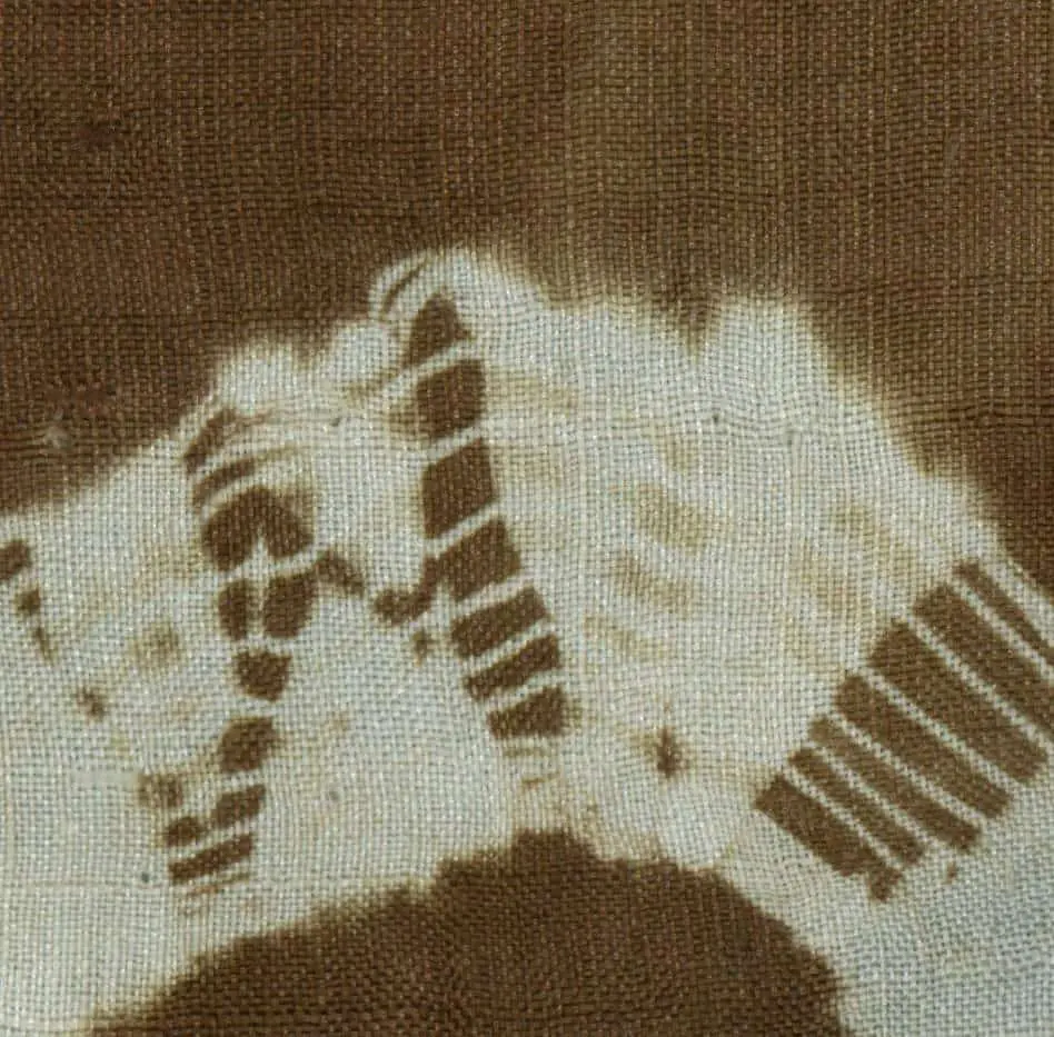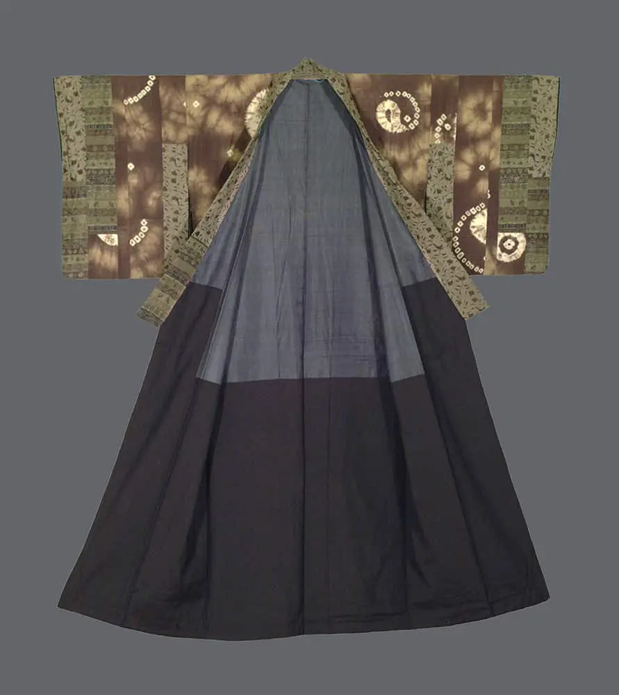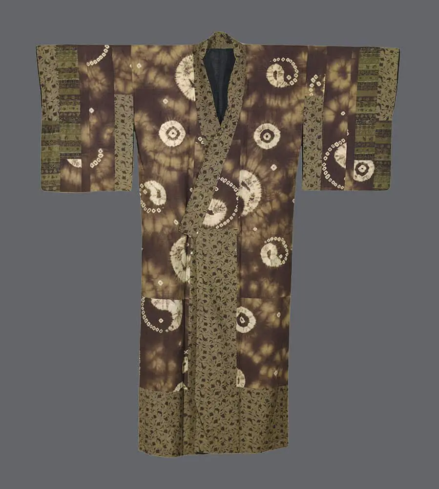 This silk dounuki exemplifies sophisticated layering of dyeing techniques. The central bodice showcases an extraordinary application of shibori resist-dyeing to create taijitu (yin-yang) symbols, where the complex binding and compression techniques produce the characteristic radiating patterns and organic, cloud-like backgrounds. The shibori process creates those distinctive starburst effects around each circular motif, with the resist-dyed areas preserving the white silk while allowing the surrounding fabric to absorb rich brown and sepia tones in unpredictable, naturalistic patterns.