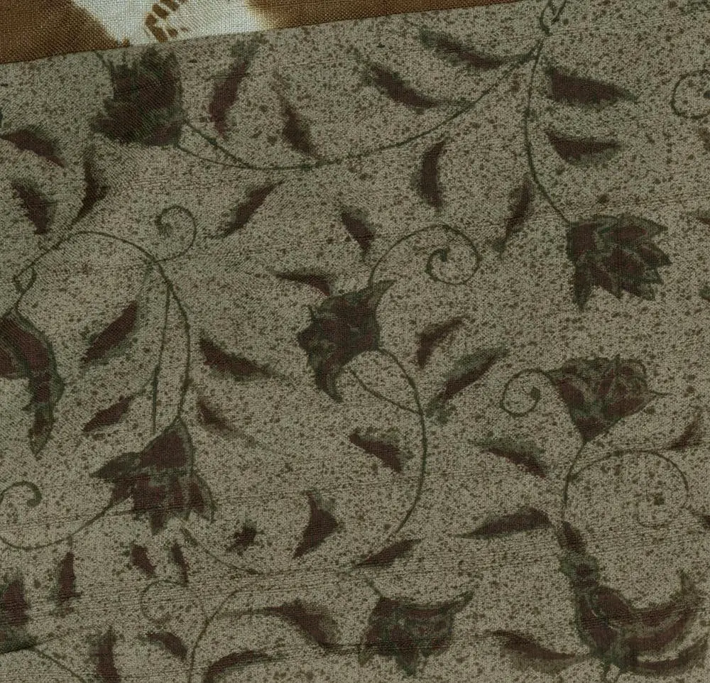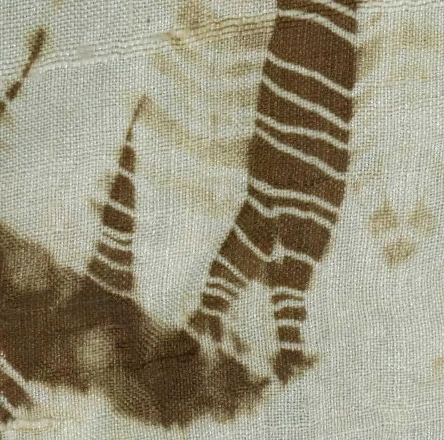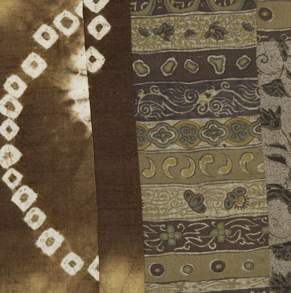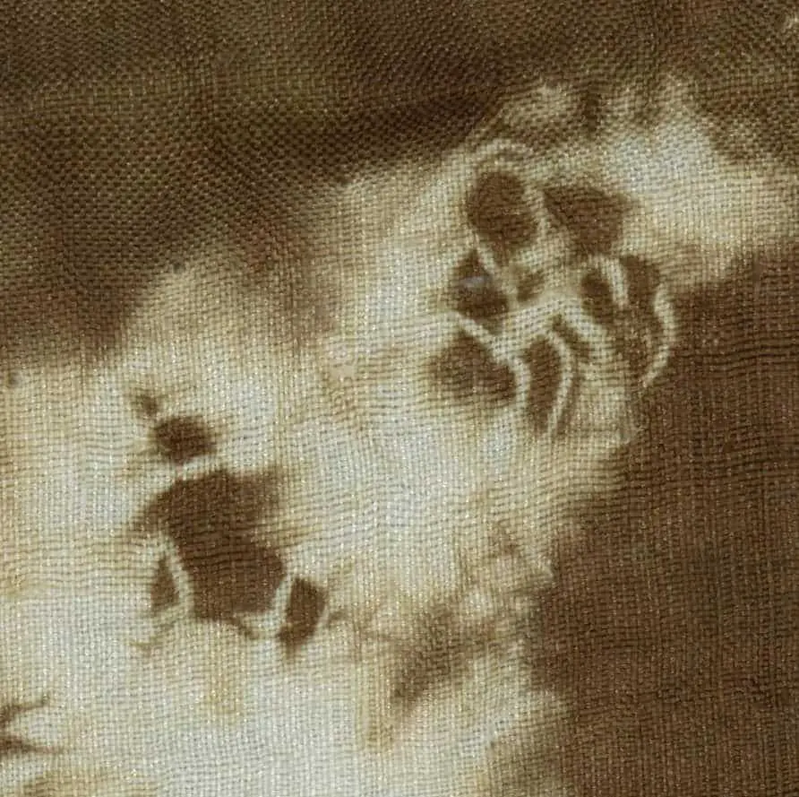 This silk dounuki exemplifies sophisticated layering of dyeing techniques. The central bodice showcases an extraordinary application of shibori resist-dyeing to create taijitu (yin-yang) symbols, where the complex binding and compression techniques produce the characteristic radiating patterns and organic, cloud-like backgrounds. The shibori process creates those distinctive starburst effects around each circular motif, with the resist-dyed areas preserving the white silk while allowing the surrounding fabric to absorb rich brown and sepia tones in unpredictable, naturalistic patterns.