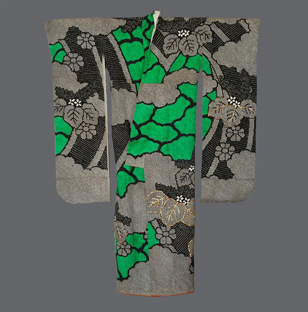 This silk furisode showcases a striking modernist interpretation of traditional Japanese textile artistry, where bold geometric abstraction meets centuries-old craftsmanship techniques. The garment features an innovative design vocabulary that echoes mid-20th century abstract expressionism and constructivism, with its dynamic composition of interlocking angular forms rendered in contrasting black, white, and vibrant green. The geometric patterns created through various shibori resist-dyeing techniques transform the traditional kimono format into what appears almost like a wearable architectural drawing or urban map.