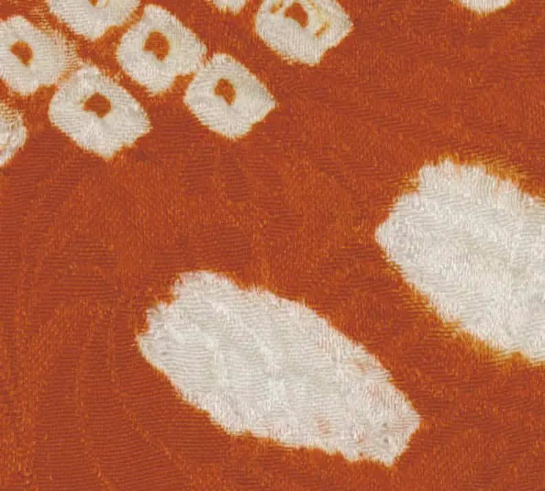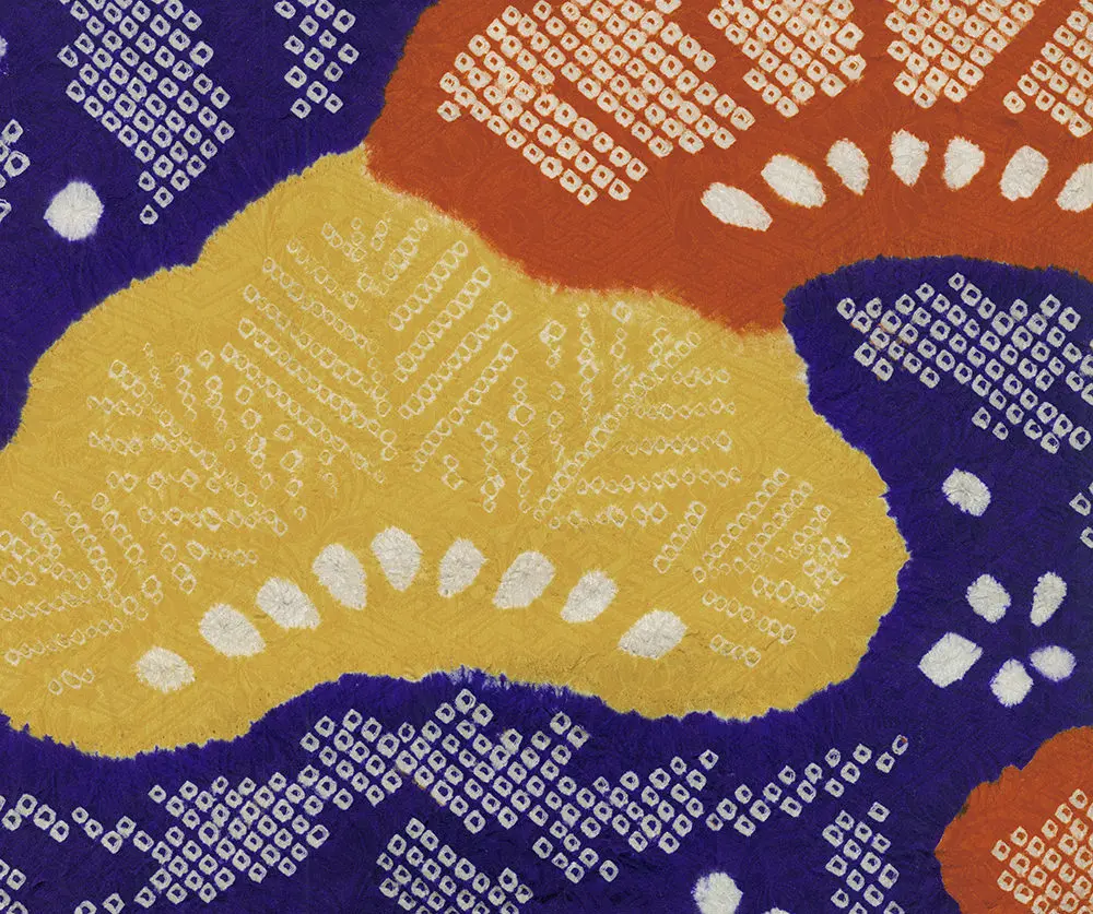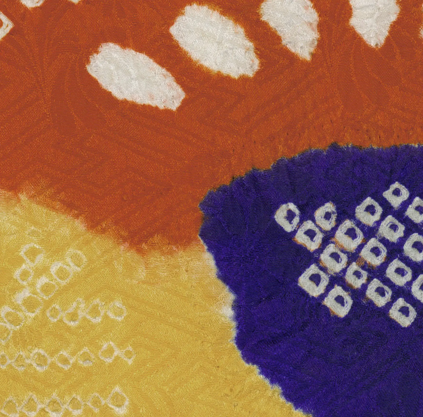 The technical execution reveals masterful control of shibori resist-dyeing processes, particularly in achieving the clean color separations and saturated hues visible throughout the composition. The detail images show the sophisticated use of kanoko (fawn spot) shibori techniques to create the small white dotted patterns within the pine shapes, demonstrating the complex binding and dyeing sequences required to achieve such precise results. The rinzu figured silk base fabric adds another layer of textural sophistication, with its woven patterns creating subtle surface variations that interact with the dyed motifs to produce additional visual depth and tactile interest.