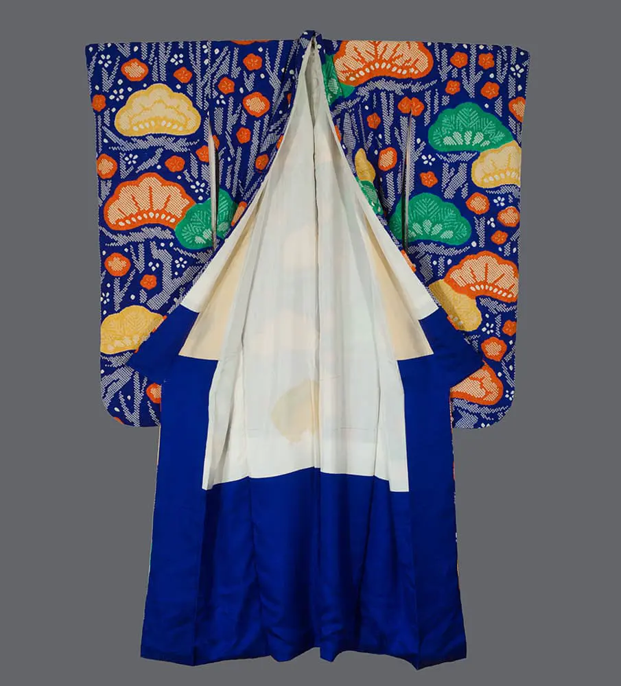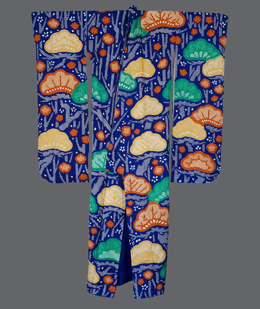 This shibori furisode represents a dynamic revival of traditional Japanese resist-dyeing techniques within the context of contemporary aesthetic sensibilities, embodying the postmodern fascination with craft authenticity and bold visual impact. The design demonstrates a sophisticated understanding of how traditional motifs can be reimagined through innovative color relationships and scaled compositions that speak to both historical continuity and contemporary fashion consciousness. The vibrant pine (matsu) motifs scattered across the deep indigo ground create an energetic visual rhythm that breaks from the more restrained palettes typically associated with classical shibori work, instead embracing the experimental spirit that characterized Japanese textile arts during the economic boom of the late 20th century.