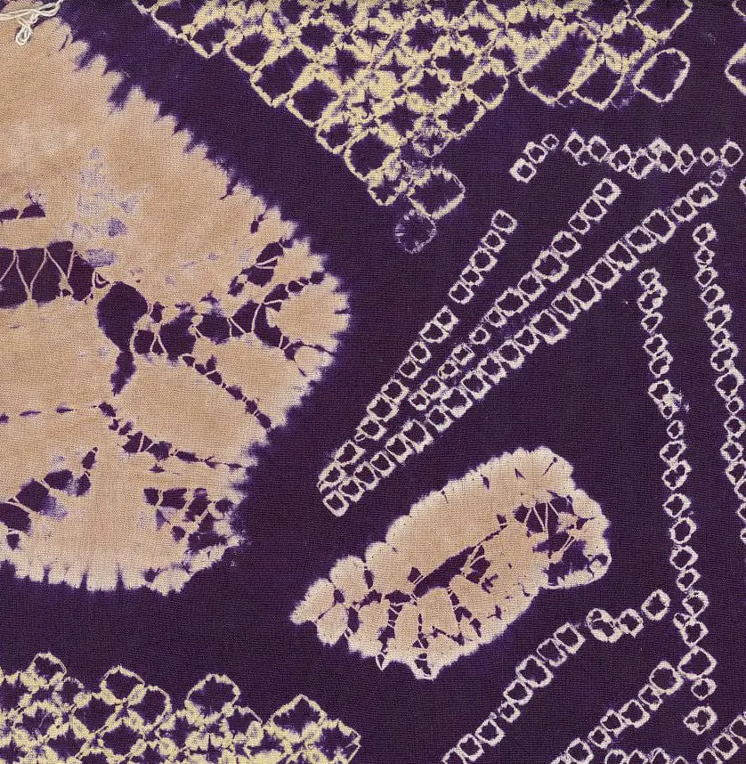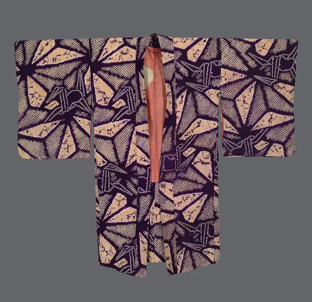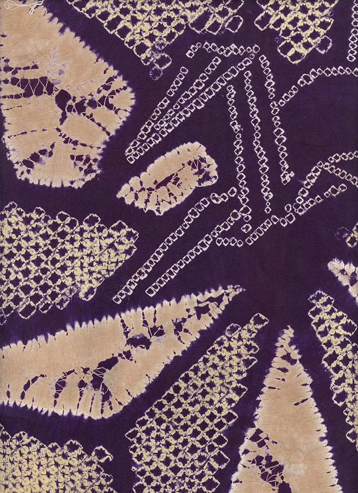 An intriguing combination of two motifs marks this piece: the origami crane (orizuru) and the asanoha (hemp leaf) pattern, both created using the shibori technique. The asanoha pattern forms the primary geometric structure, creating a tessellating background of interlocking six-pointed stars, providing a strong, rhythmic foundation for the overall composition. Nestled within and atop this geometric framework are delicately rendered paper cranes. These orizuru appear as small, stylized figures scattered across the fabric. Their placement seems almost playful, as if the cranes are alighting upon or emerging from the asanoha pattern. The color palette is dramatic and eye-catching, with deep purple designs set against a warm, peachy orange background. The geometric precision and use of bold, contrasting colors suggest an affinity to the Art Deco movement, though it's important to note that Japanese geometric patterns and stylization predate the Art Deco movement by centuries. Additionally, the intricate patterns, textured effect, and complex interplay of shapes and colors evoke Op Art, engaging the viewer's perception in a characteristic manner.