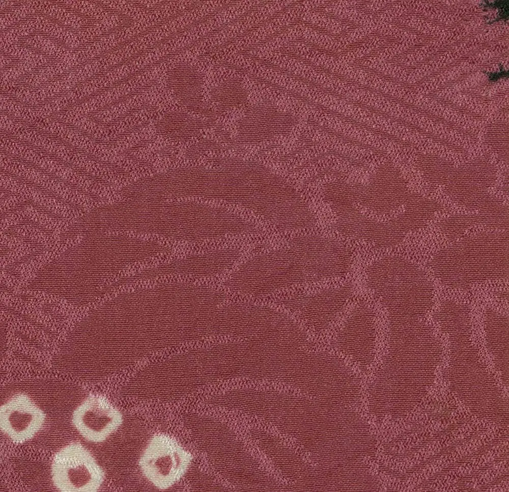 A vibrant shibori-created floral pattern exemplifies the Japanese artistic tradition while incorporating what appears to be early modernist influences. The design reveals bold, stylized camellia flowers in coral pink and yellow against a serene turquoise background, with black leaves creating dramatic negative space. The figured silk background also contains subtle, lighter floral and sayagata patterns that add depth and sophistication to the overall design. The composition demonstrates a masterful balance between naturalistic and abstract elements, a hallmark of Japanese textile design. The flowers are simplified yet immediately recognizable, showing the influence of traditional Japanese katagami (paper stencil) techniques. The bold, almost graphic quality of the design, with its clear outlines and strong color blocks, suggests an affinity with early 20th-century modernist movements, though such stylization was already present in Japanese art centuries earlier. The color palette is particularly striking and modern, combining the turquoise background with warm coral pink and yellow blooms. This color combination creates a dynamic visual tension while maintaining harmony, showing sophisticated color theory at work. The black leaves provide strong structural elements that guide the eye through the composition, creating rhythm and movement across the garment's surface.