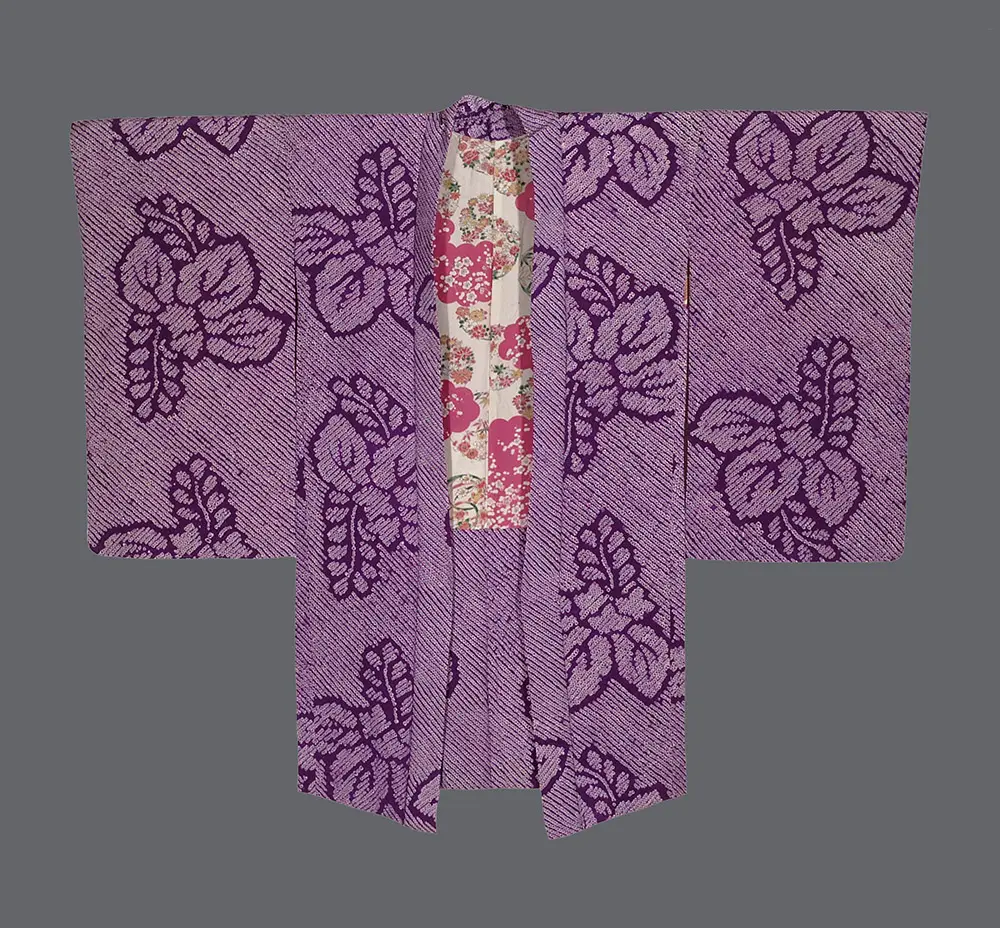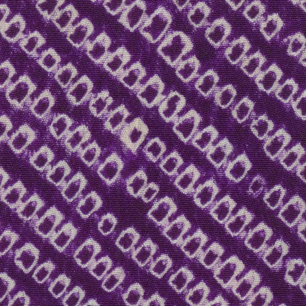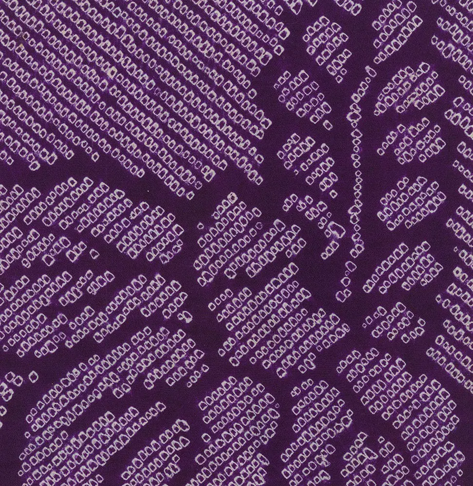 Classic Japanese textile design emerges through a repeating pattern of paulownia motifs in deep purple against a lighter lavender background. All patterning appears through shibori, which creates a subtle textural effect that adds depth and sophistication to the overall design. The paulownia motifs are rendered in a bold, graphic style that demonstrates the Japanese aesthetic principle of simplification and abstraction. Each flower head is composed of several rounded petals or leaves arranged in a balanced, symmetrical composition, with accompanying foliage elements that add movement and organic flow to the pattern. The monochromatic purple color scheme is particularly noteworthy, as it exemplifies the Japanese appreciation for subtle gradations of a single color, known as "tone on tone" or "ton-sur-ton" in Western design terminology. This sophisticated use of color values predates similar approaches that became popular in Western Art Deco textiles of the 1920s and 1930s. The spacing and arrangement of the motifs shows careful attention to negative space, or "ma" in Japanese aesthetics. The flowers are distributed across the fabric in a seemingly random but carefully balanced pattern that creates visual interest while maintaining harmony and avoiding overcrowding. This approach to pattern design, which appears effortless yet is carefully calculated, is a hallmark of Japanese textile arts that would later influence Western modernist approaches to surface design.