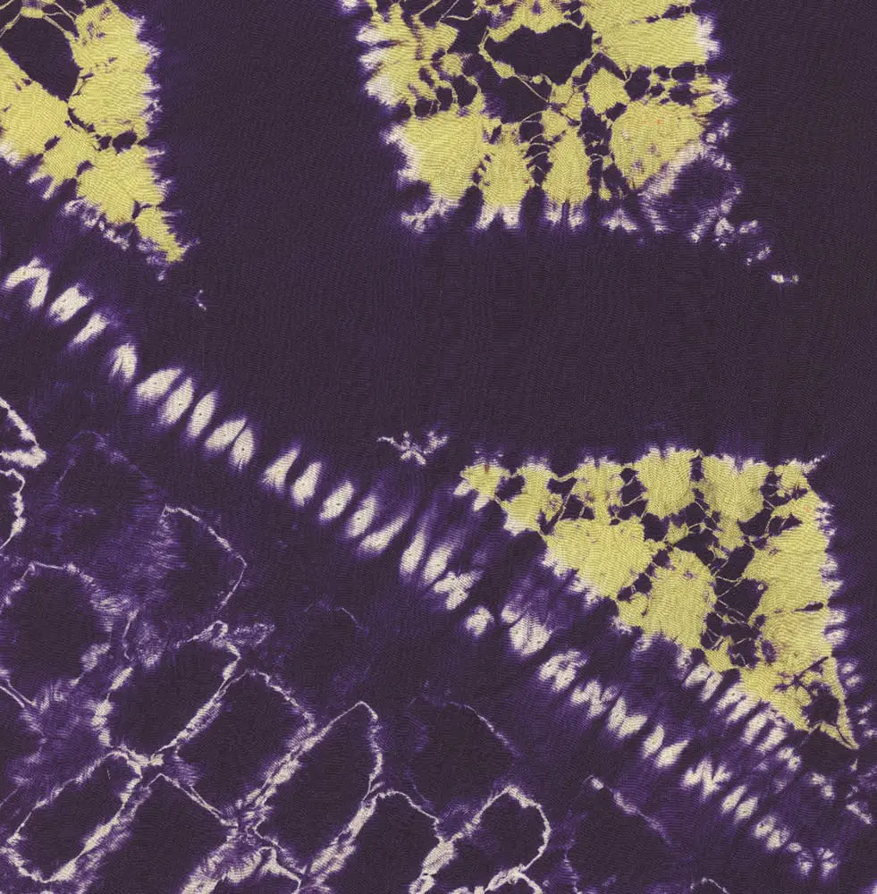 The design reflects the dynamic cultural period of the Taisho era, when Japanese artisans were experimenting with bolder color palettes and more assertive geometric compositions while maintaining their profound connection to traditional techniques. The strong diagonal emphasis and systematic grid structure echo the geometric abstraction emerging in international art movements of the time, particularly the influence of Art Nouveau's transition toward Art Deco, while the masterful shibori execution maintains distinctly Japanese aesthetic values of controlled spontaneity and harmonious asymmetry. The vibrant purple and golden yellow color combination was particularly fashionable during this period, representing both luxury and modernity.