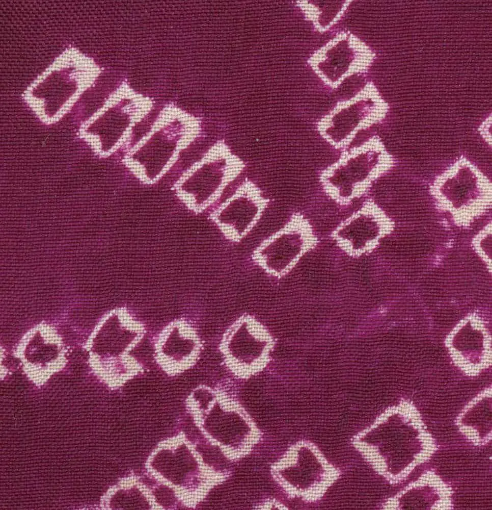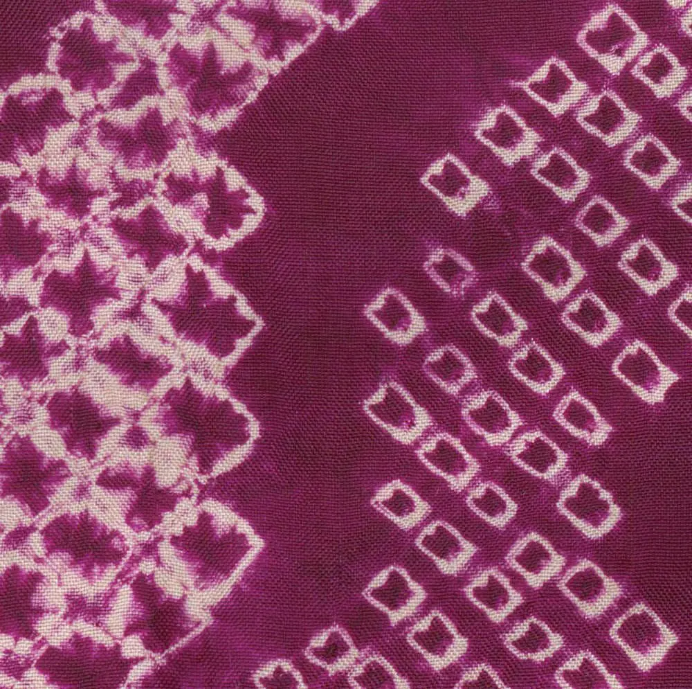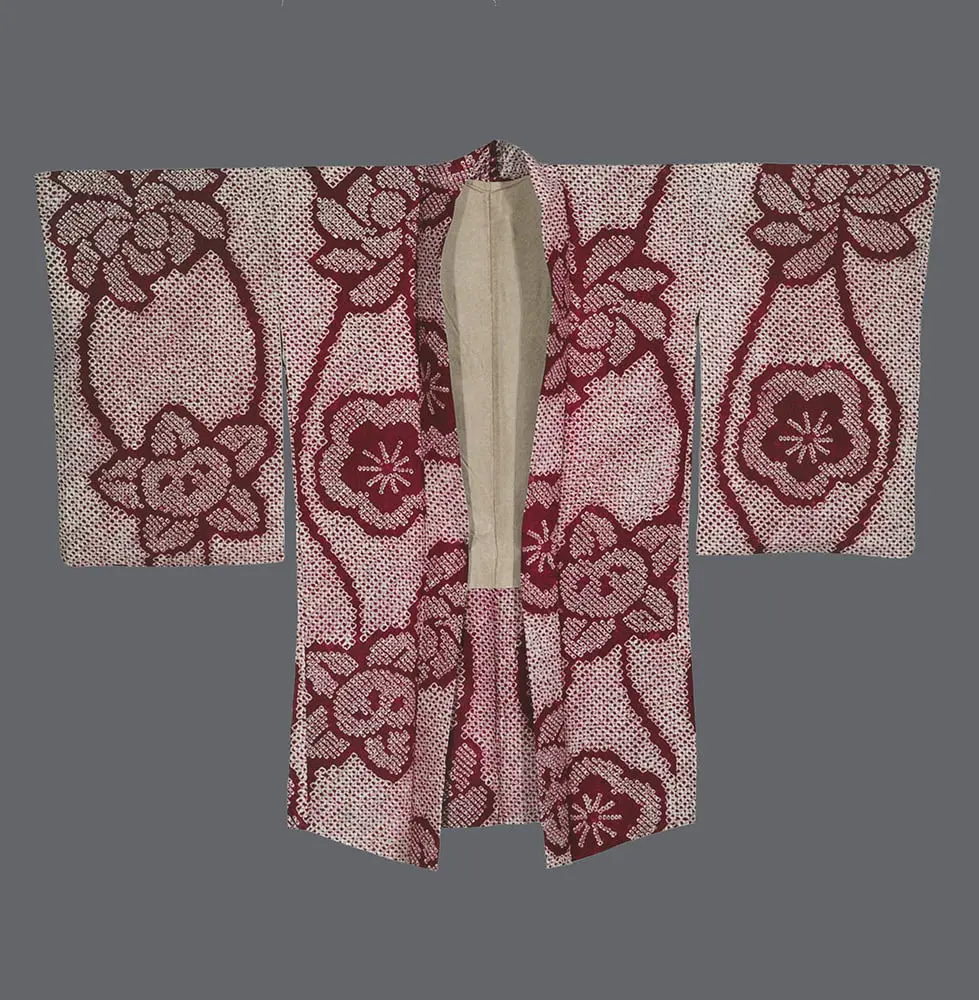 This silk haori showcases the sophisticated artistry of Japanese shibori dyeing techniques, creating a striking composition of traditional motifs against a subtly textured background. The garment features an elegant arrangement of tachibana (wild orange) and chrysanthemum patterns rendered in deep burgundy against a cream-colored ground, both achieved through the resist-dyeing method of shibori that creates the characteristic stippled, organic texture visible throughout the textile.