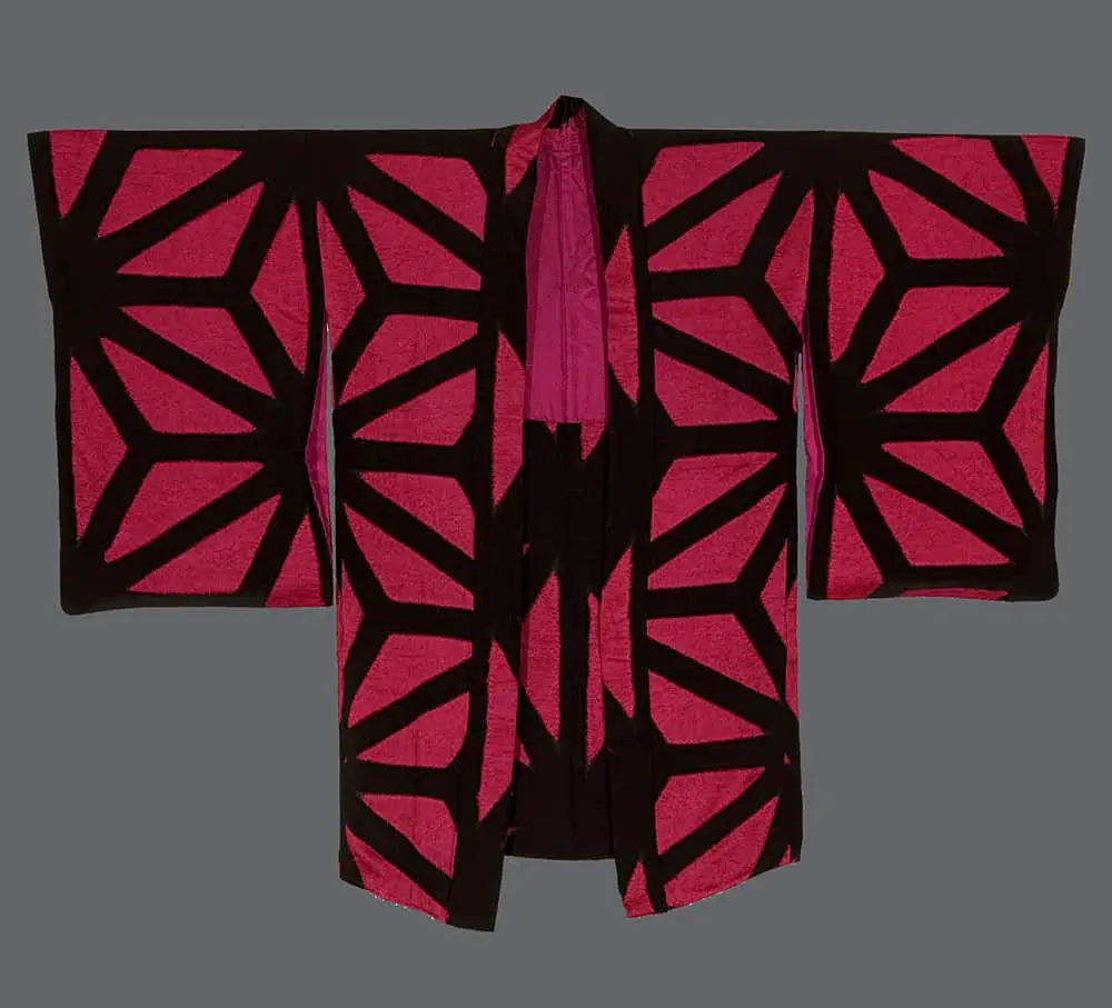 The asanoha pattern itself is deeply rooted in Japanese culture, however, the scale, boldness, and stark color contrast of the design also resonate strongly with Art Deco aesthetics. Additionally, the precision of the pattern also gives an almost Op Art quality to the haori. The way the precise lines and stark contrast play with visual perception is reminiscent of Optical Art. The overall aesthetic of this haori is one of sophisticated modernity, blending a traditional Japanese motif with a more contemporary, Western-influenced sensibility. The garment exudes a sense of power and elegance, reflecting the dynamism of the Art Deco era while remaining firmly grounded in Japanese design heritage. The simplicity of the two-color palette further enhances the design's impact, allowing the intricate asanoha pattern, brought to life through shibori, to take center stage.