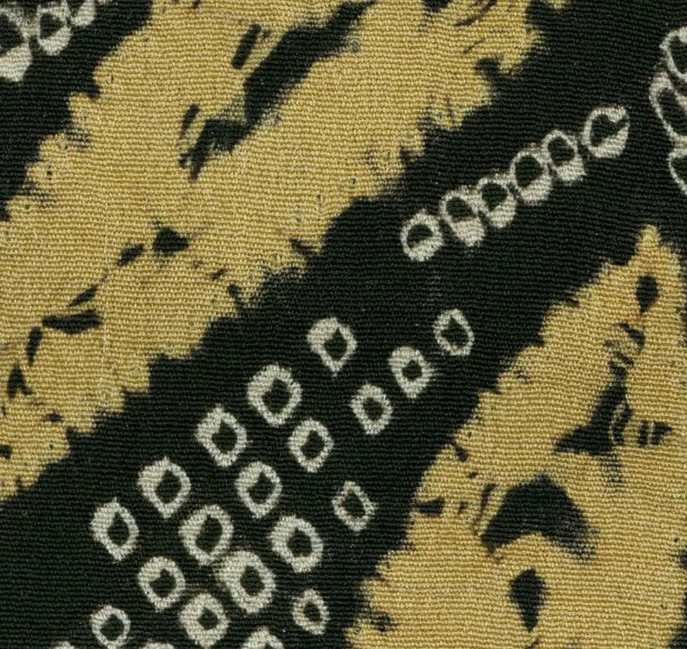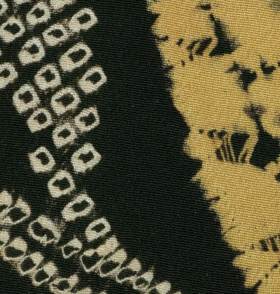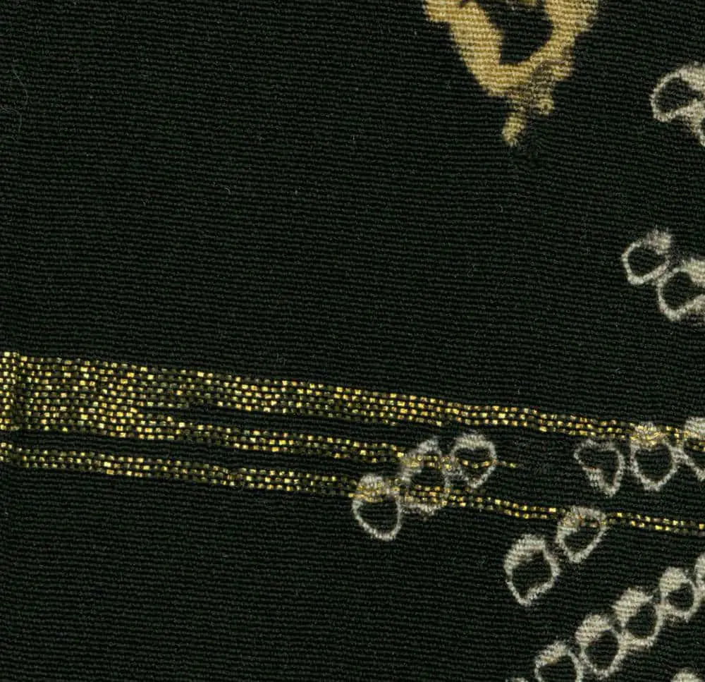 Against a rich black background, a striking bamboo motif emerges, brought to life through the intricate shibori technique. The bamboo stalks appear in silvery gray through precise resist-dyeing, while the leaves gain highlights in metallic gold. The composition shows a distinctly Japanese appreciation for asymmetrical balance, with the bamboo stalks arranged in a dynamic pattern that creates visual movement across the garment. This aesthetic approach reflects Art Deco sensibilities, particularly in the stylized, geometric interpretation of natural forms. The limited color palette of black, silver-gray, gold, and subtle coral accents exhibits a restraint and elegance that aligns with both traditional Japanese aesthetics and modernist principles of reduction to essential elements. What's particularly notable is how the shibori technique creates subtle textural variations that add depth to the flat surface, anticipating some of the concerns of mid-20th century Abstract Expressionism regarding texture and material qualities. The way the bamboo pattern is abstracted while maintaining its essential natural character shows an approach to stylization that would later become central to modernist design principles. Small coral-colored accents provide subtle punctuation to the composition, demonstrating the Japanese principle of using minimal color for maximum effect. The overall design achieves a remarkable balance between decorative impact and spatial restraint, embodying the Japanese concept of "ma" - the meaningful use of negative space. This sophisticated handling of space and pattern would later influence Western abstract artists and designers, though here it emerges from a distinctly Japanese aesthetic tradition.