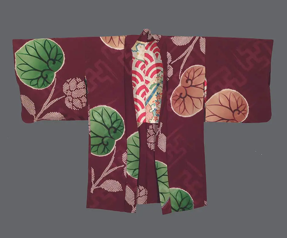 This light rinzu silk jacket boasts hollyhock motifs, crafted through a combination of shibori and painting techniques. The sleeves have been adjusted, taken in approximately 6 inches, but this alteration can be reversed if desired. Measuring 47 inches from sleeve-end to sleeve-end and 31 inches in height (119 cm x 79 cm), it remains in very good condition.