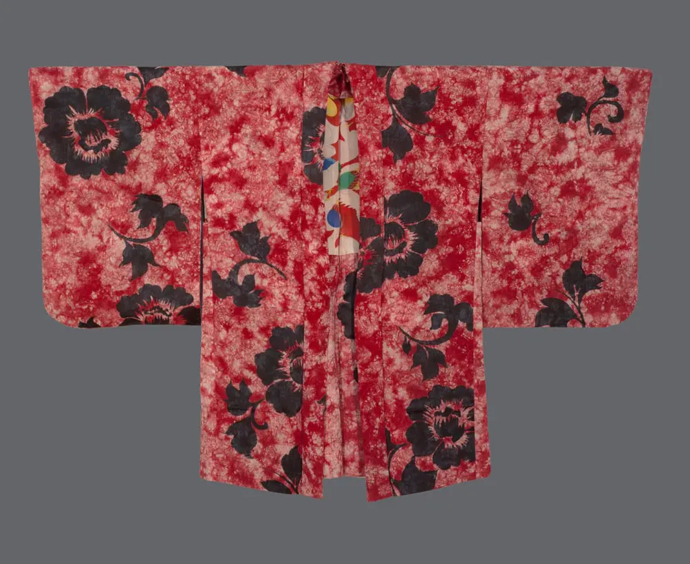 This haori showcases bold black peony motifs against a striking mottled red background that creates an almost abstract expressionist effect. The peonies are rendered as powerful silhouettes with characteristic ruffled petals and curving stems, their dark forms creating strong graphic contrast against the variegated crimson ground. The mottled background technique, possibly achieved through resist-dyeing or deliberate fabric manipulation, produces an organic, cloud-like texture that ranges from deep burgundy to lighter coral tones, giving the entire surface a dynamic, almost volcanic quality.