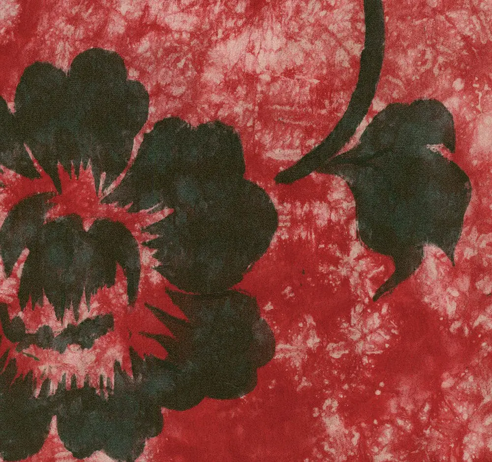 The peony motif carries significant cultural weight in Japanese aesthetics, traditionally symbolizing honor, wealth, and bravery, while also representing the fleeting nature of life due to the flower's brief but spectacular bloom. The choice to render these flowers as stark black silhouettes rather than naturalistic colors reflects the aesthetic experimentation of the post-war period, when Japanese textile designers were exploring more abstract and modernist approaches to traditional motifs. The overall composition demonstrates influences from mid-century modern design movements, particularly in its bold use of contrast and the gestural quality of the background treatment.