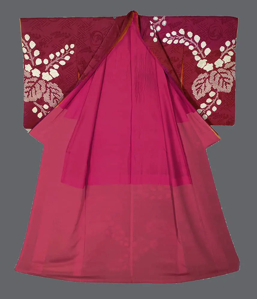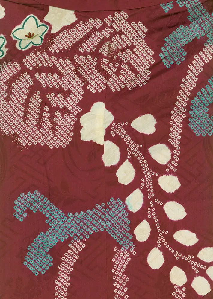 This kimono showcases an intricate shibori resist-dyeing program executed across the entire surface of rinzu silk, creating a sophisticated interplay between the lustrous figured weave and the organic, hand-crafted resist patterns. The design centers on paulownia (kiri) motifs - the imperial flower that symbolizes nobility, honor, and virtue - rendered through various shibori binding techniques that create both large leaf forms and smaller geometric elements scattered across the rich burgundy ground.