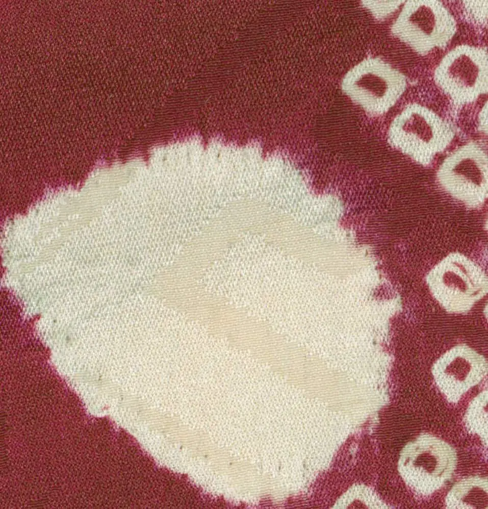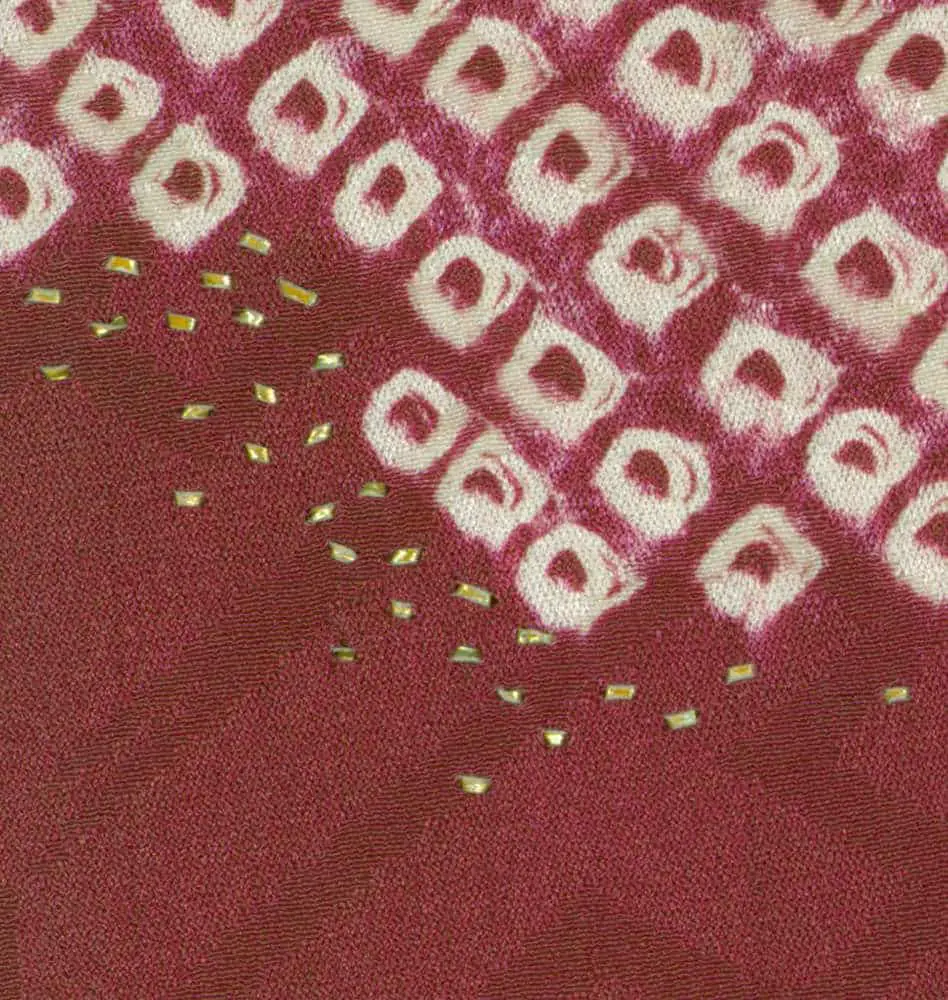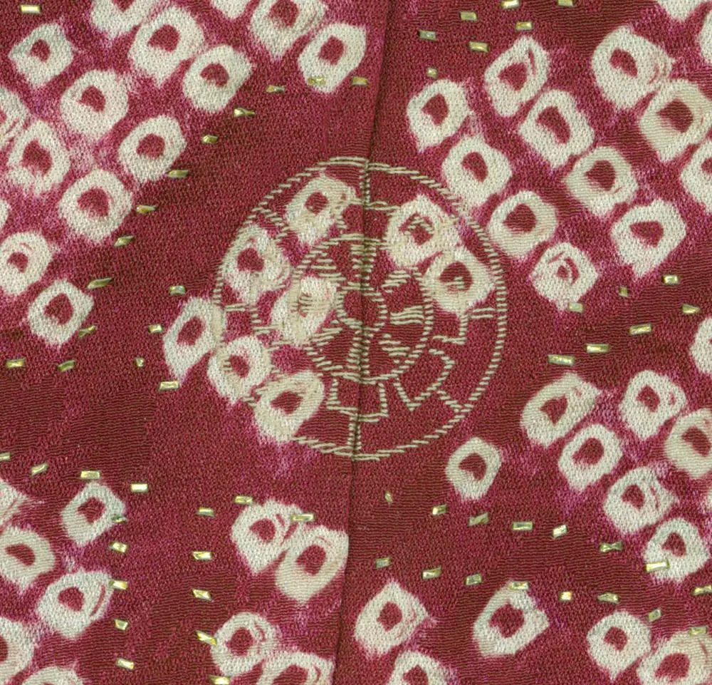 The technical execution reveals extraordinary skill in coordinating multiple processes - the underlying rinzu weave creates a subtle geometric foundation, while the shibori work ranges from large-scale leaf forms requiring complex binding techniques to tiny dots that may have been created using small stones or seeds as resist elements. The strategic placement of embroidery highlights and gold metallic thread outlining demonstrates the period's taste for luxurious surface enrichment, while the overall composition reflects the Japanese aesthetic principle of finding beauty in the controlled accident - the slight irregularities inherent in hand-resist techniques that give life and movement to the design.