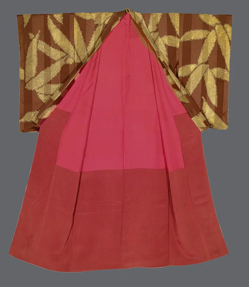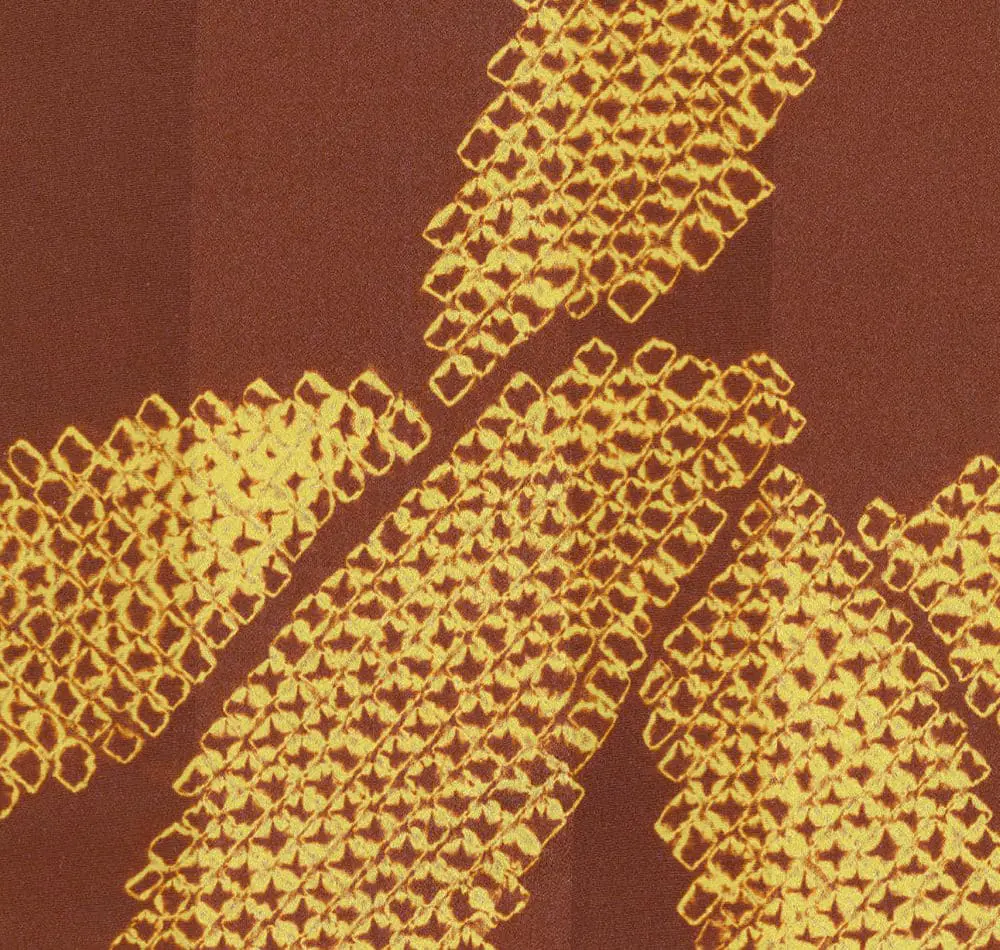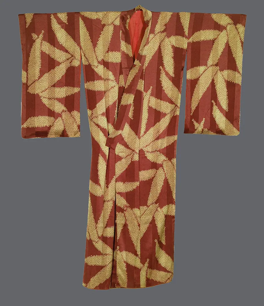 This silk kimono features a rinzu damask ground woven with a subtle bamboo stalk pattern that creates textural depth through the contrast of matte and lustrous silk surfaces. Over this elegant foundation, bold shibori-dyed bamboo leaves in golden yellow create a striking visual counterpoint against the rich burgundy ground, their organic forms dancing across the textile in seemingly random but carefully balanced arrangements.