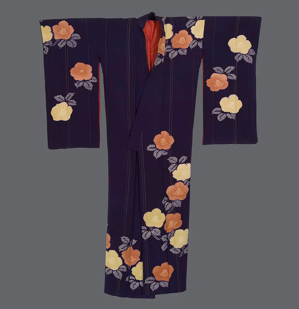 The design philosophy reveals a sophisticated understanding of negative space and asymmetrical balance characteristic of Japanese aesthetics, yet the bold scale and rhythmic repetition of the camellia motifs suggest influence from contemporary Western decorative arts. The flowers themselves—rendered in warm yellow and russet tones—appear to float against the deep purple ground in a manner that recalls both traditional Japanese painting's use of void space and the modernist tendency toward abstraction. The metallic thread accents create vertical linear elements that provide structural coherence to the composition while adding a luxurious dimensionality that catches and reflects light as the wearer moves.
